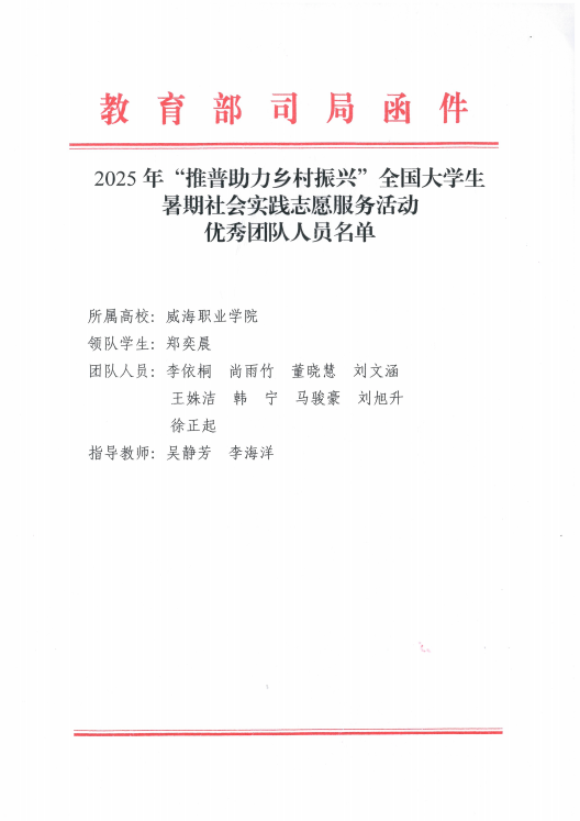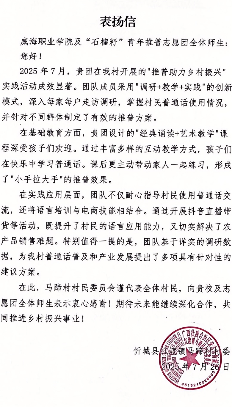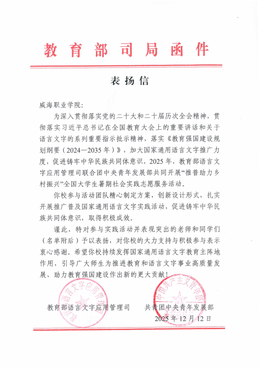 近日,威海职业学院收到来自教育部语言文字应用管理司和共青团中央青年发展部的表扬信。在2025年“推普助力乡村振兴”全国大学生暑期社会实践志愿服务活动中,该校“石榴籽”青年推普实践团在全国1680所高校8013支队伍中脱颖而出,获评“全国大学生暑期社会实践志愿服务活动优秀团队”。从全国范围来看,获评该优秀团队的数量不足5%。
