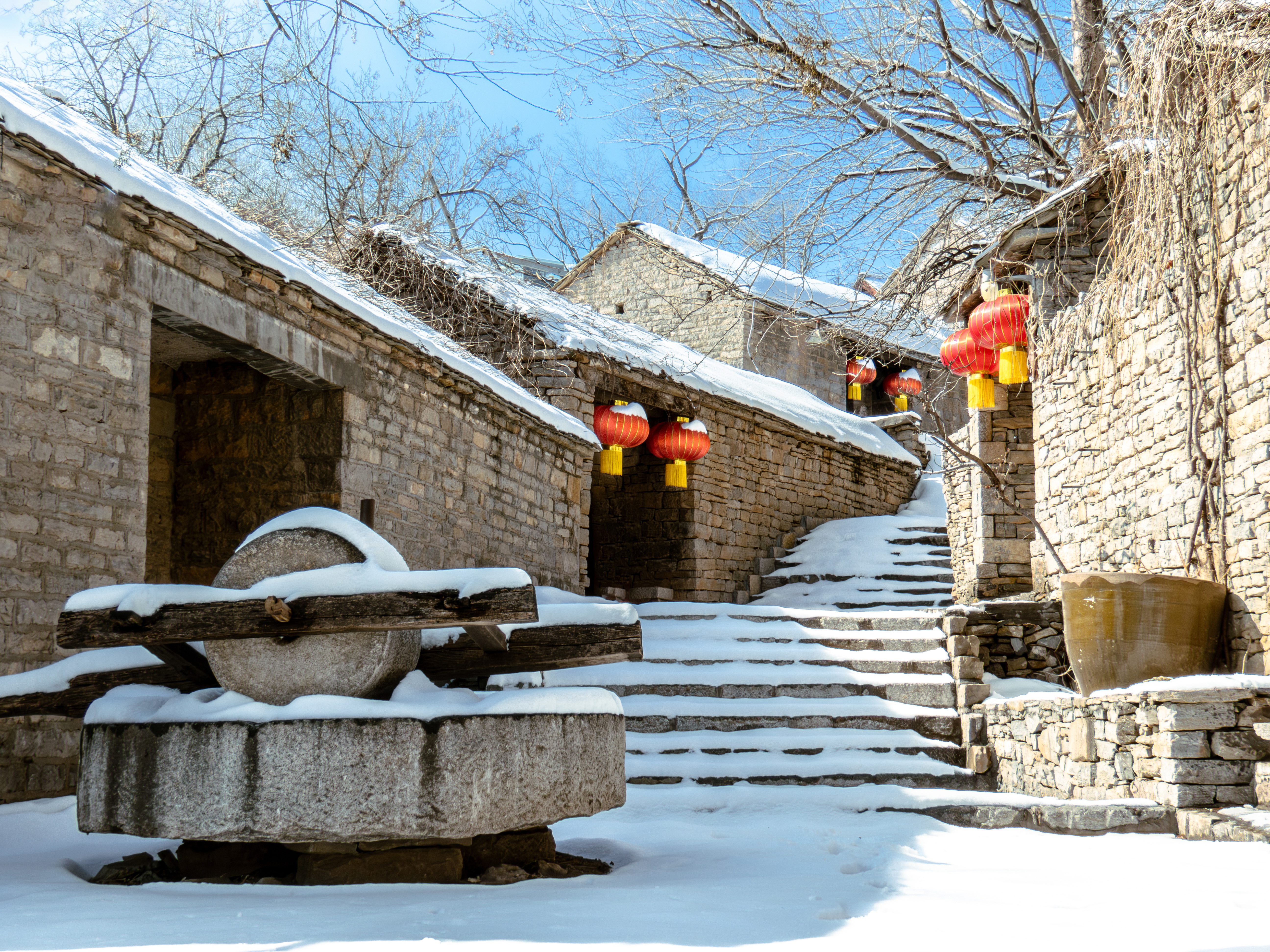 在枣庄翼云石头部落,雪覆石巷红灯悬,碾盘静卧待春归。杨开泰摄点击报送作品>>>专题|“大美山东”主题活动
