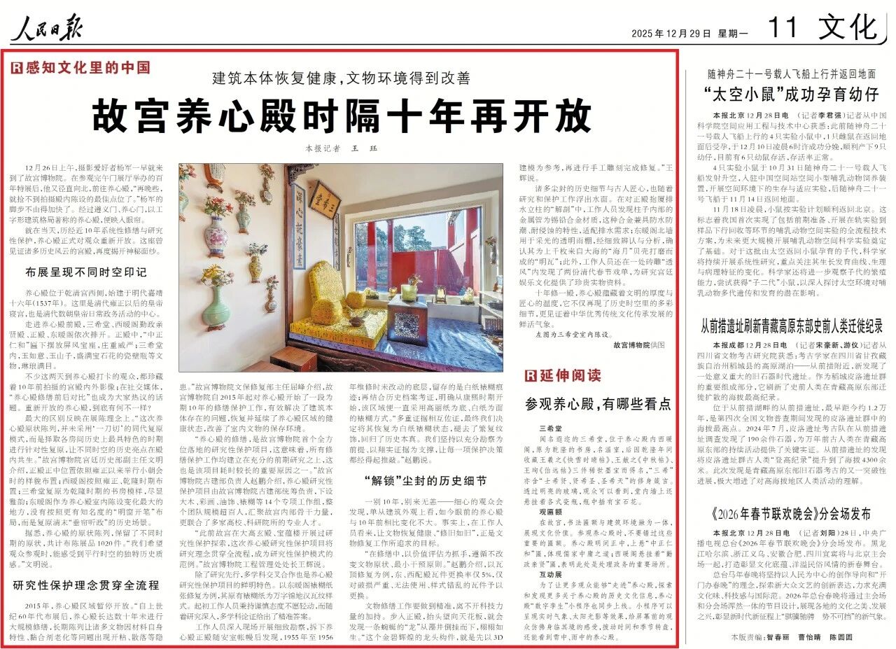 十年修一殿,养心殿蕴藏着文明的厚度与匠心的温度,它不仅再现了历史时空里的多彩细节,更见证着中华优秀传统文化传承发展的鲜活气象。