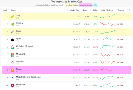 随着白银价格不断攀升,目前该贵金属市值已超越苹果,晋升为全球第三大资产,仅低于黄金和英伟达。
