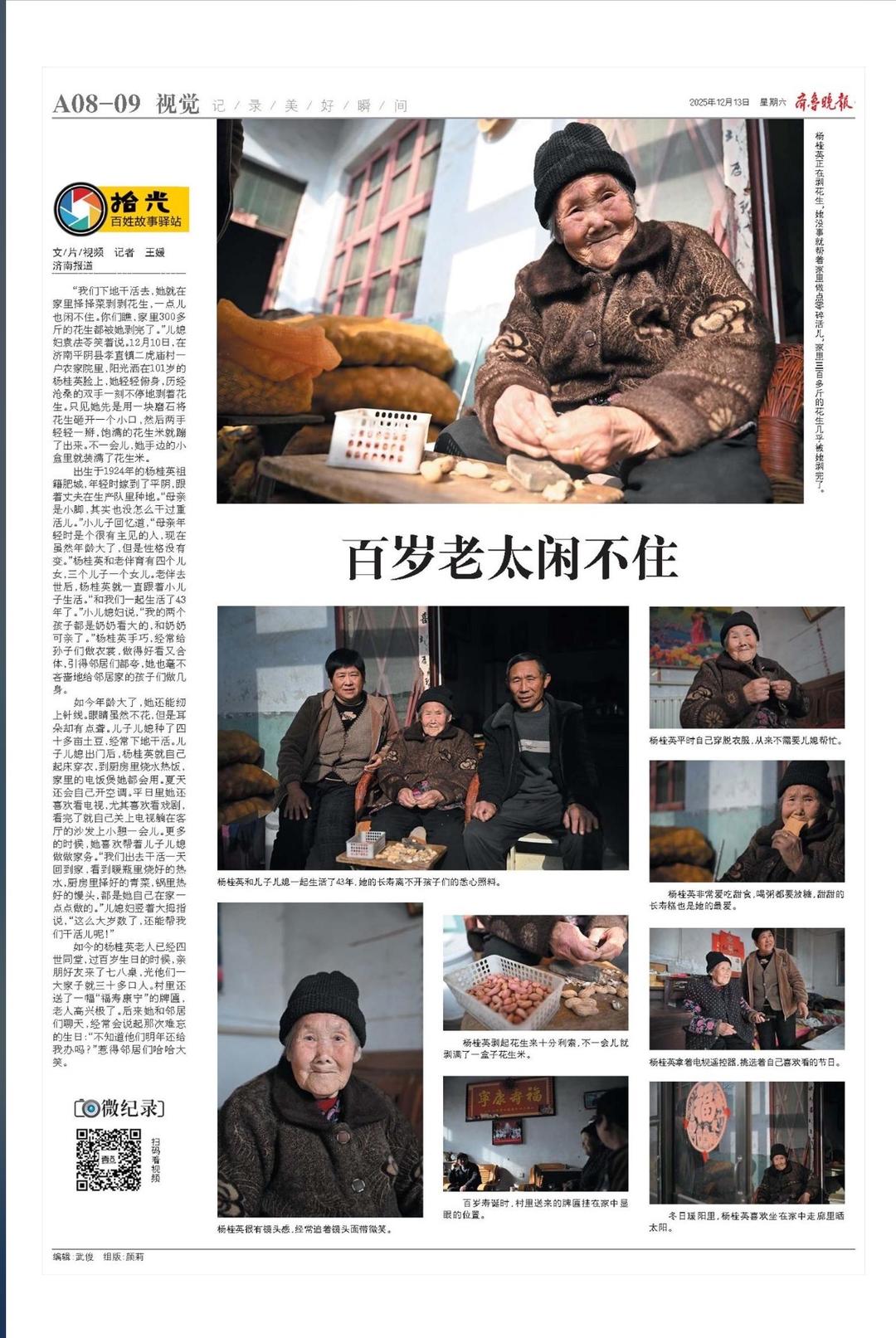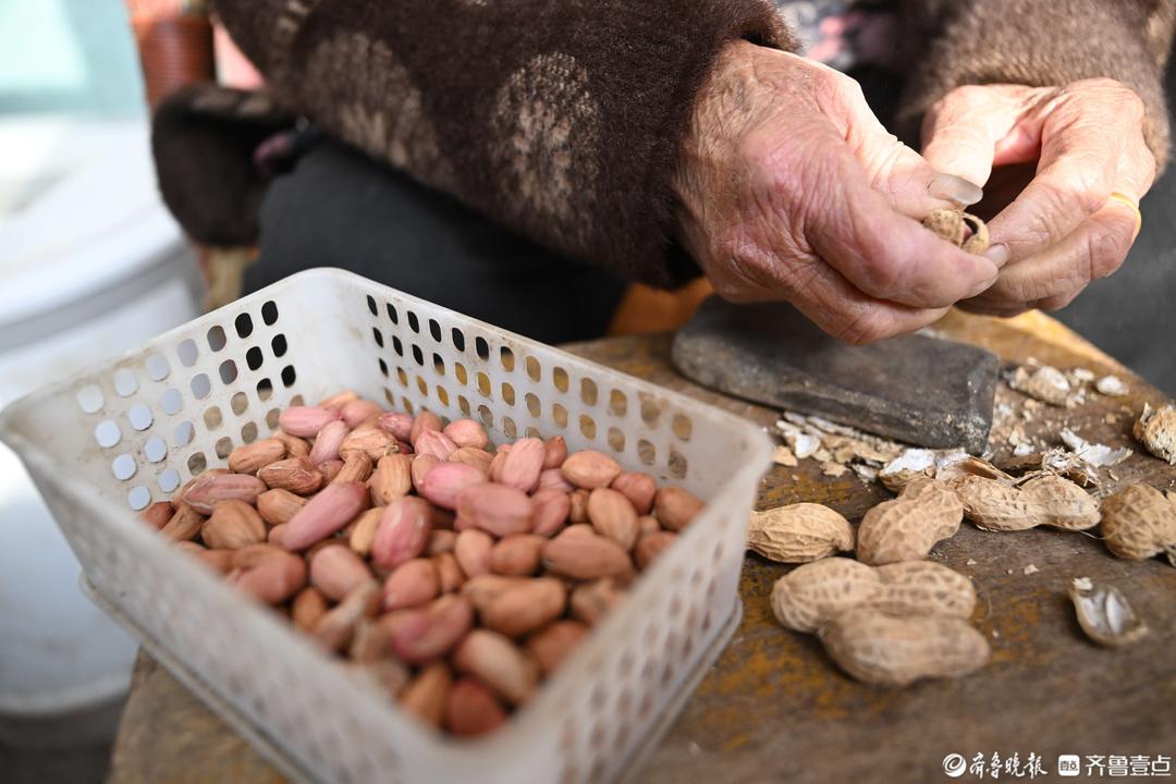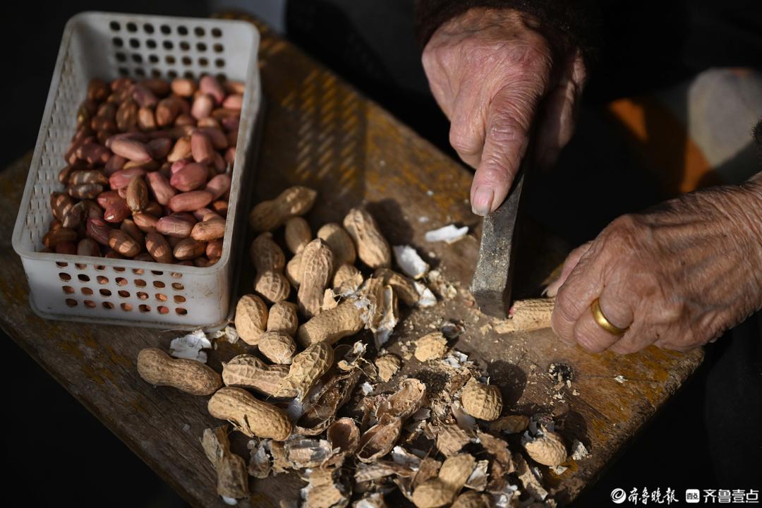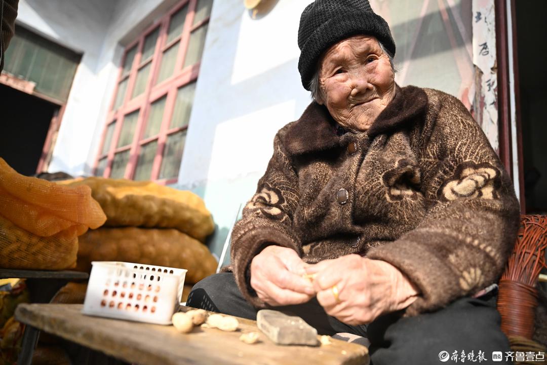 “我们下地干活去,她就在家里择择菜剥剥花生,一点儿也闲不住。你们瞧,家里300多斤的花生都被她剥完了。”儿媳妇袁法苓笑着说。在济南平阴县孝直镇二虎庙村一户农家院里,阳光洒在101岁的杨桂英脸上,她轻轻俯身,历经沧桑的双手一刻不停地剥着花生。只见她先是用一块磨石将花生砸开一个小口,然后两手轻轻一掰,饱满的花生米就蹦了出来。不一会儿,她手边的小盒里就装满了花生米。