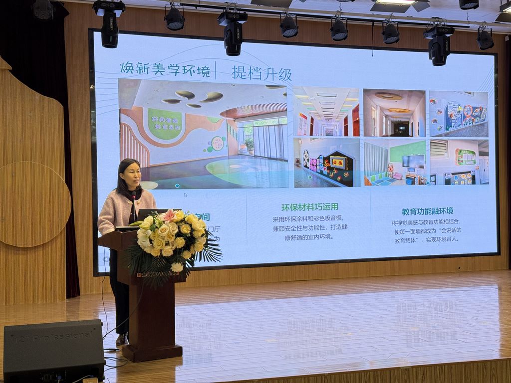 活动伊始,全体参会人员在多功能厅集中聆听了利津县第三实验幼儿园园长蒋玲题为“锚定科学保教 深耕育人实践”的工作汇报。蒋玲从园所环境焕新、课程多元发展、教师专业成长、城乡融合共进等七个维度展开详细阐述。汇报内容务实深刻、数据详实,赢得了在场嘉宾的广泛认可。