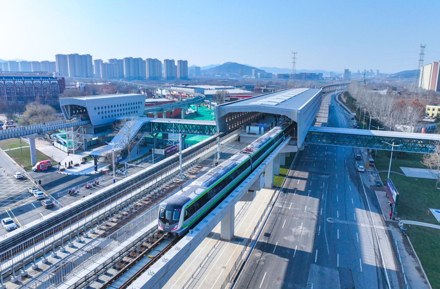 图为12月27日上午10点15分,济南地铁8号线列车从山东职业学院站驶出。