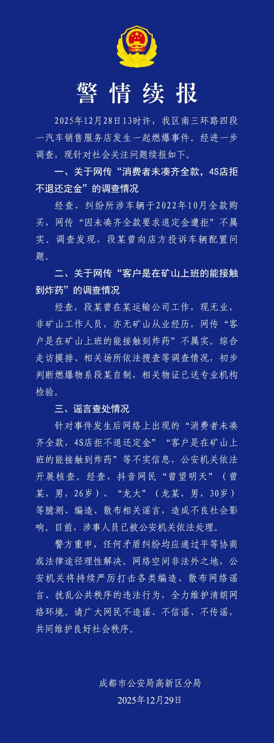 成都警方再通报4S店燃爆事件:“店方不退定金”不实,两人造谣被处理