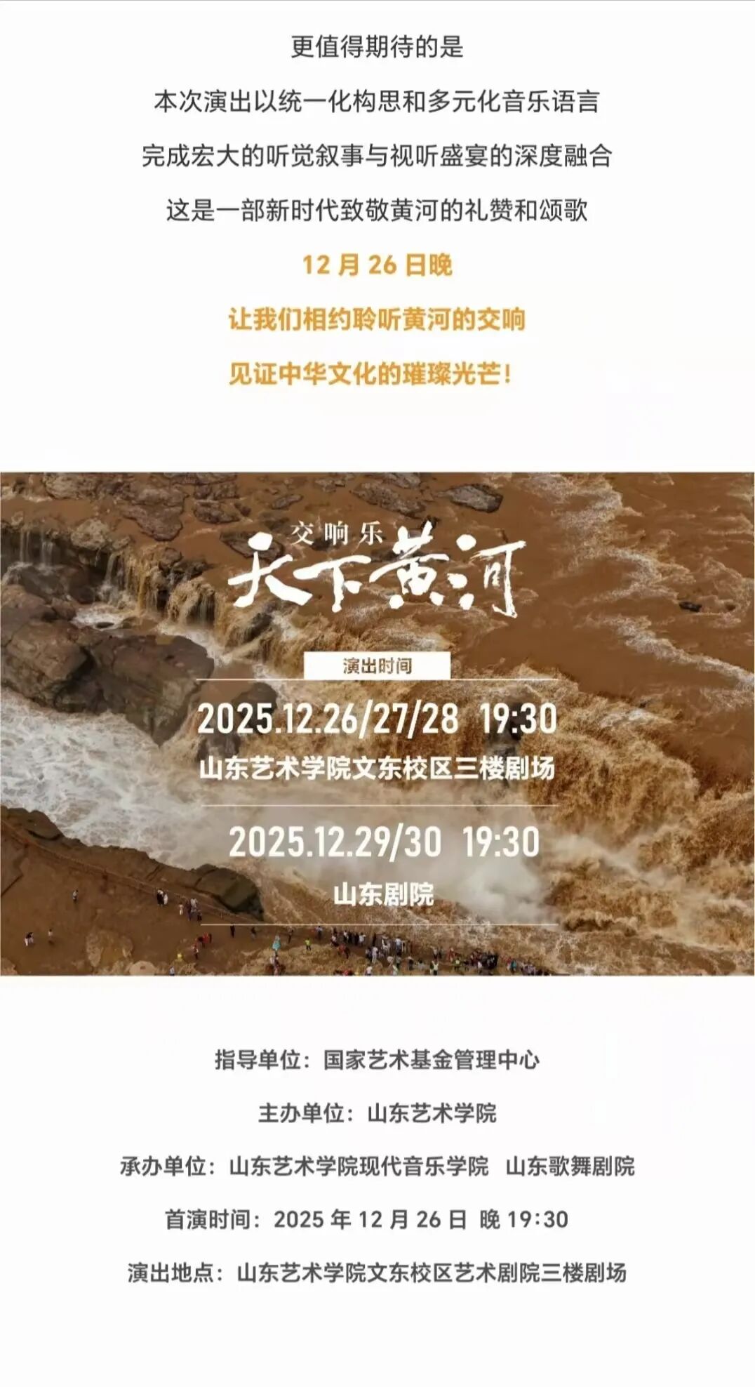 12月26日至12月28日,国家艺术基金2025年度大型舞台剧和作品创作资助项目——交响乐《天下黄河》在山东艺术学院文东校区精彩上演。