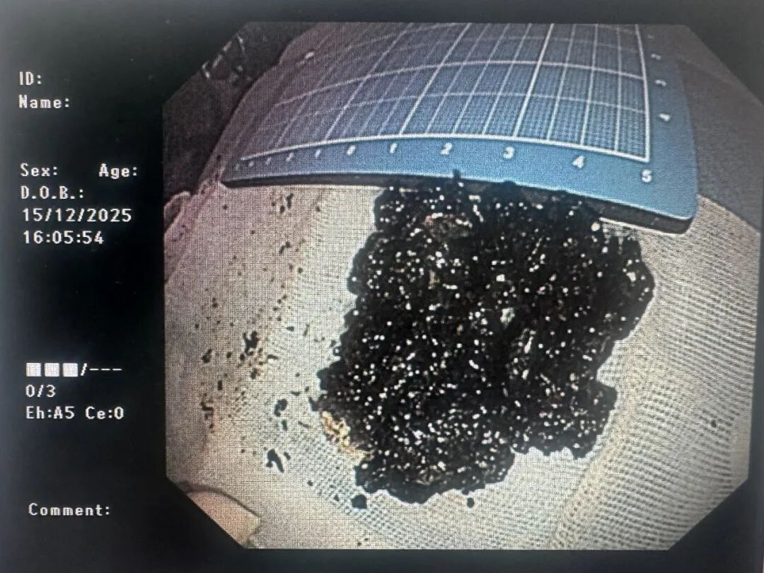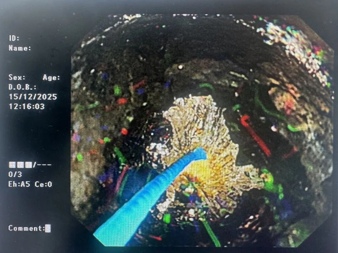 支架置入约2周后,手术团队将液电激光碎石探头经已建立的通道精准导入,对患者胆囊内一枚直径达4厘米的巨大坚韧结石进行碎裂。在李金厚的精细操作及内镜中心护理团队的默契协作下,最终将结石碎裂成可排出的细小颗粒并取出体外,彻底解除了病灶。患者术后恢复顺利,已康复出院。