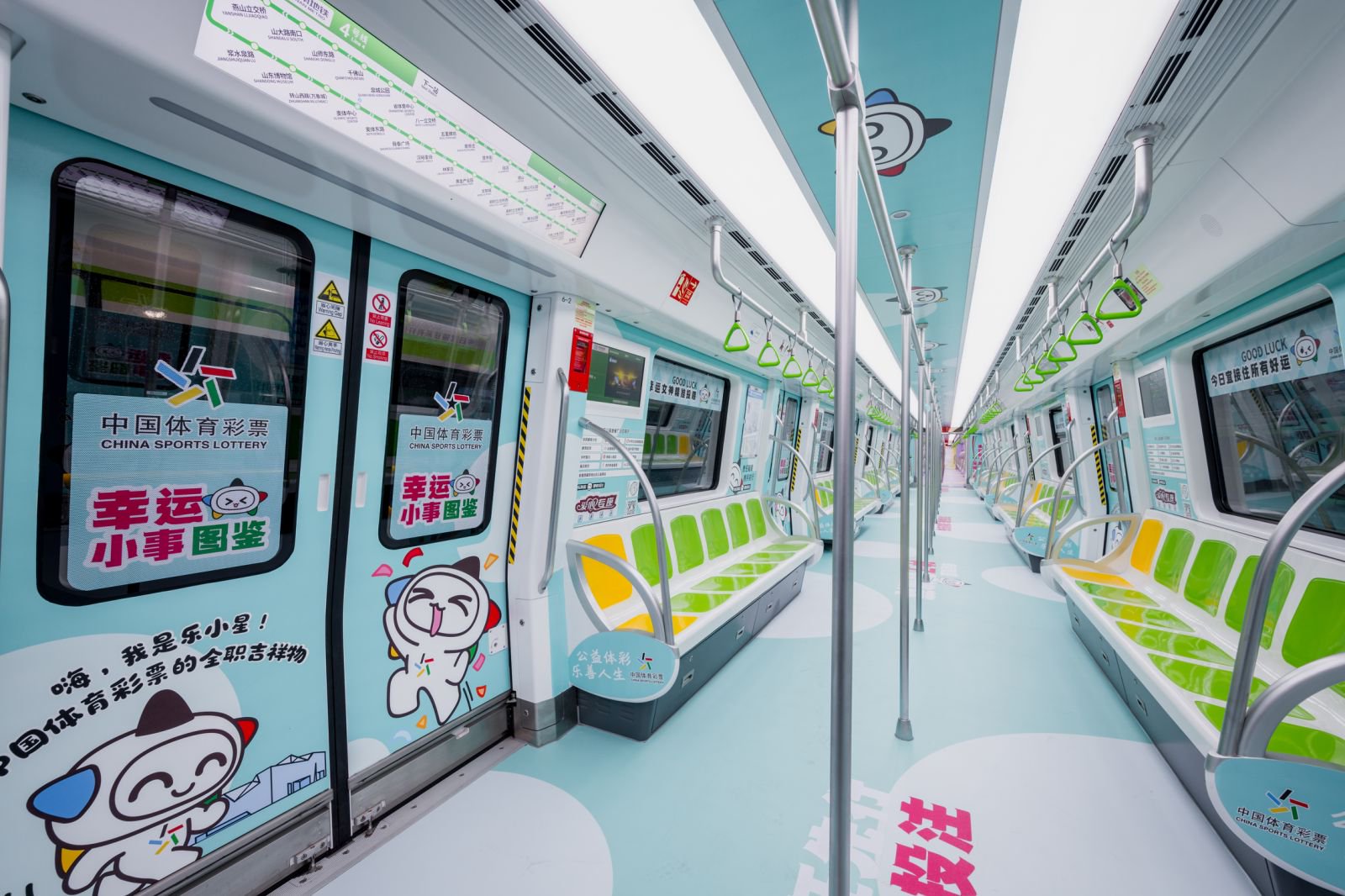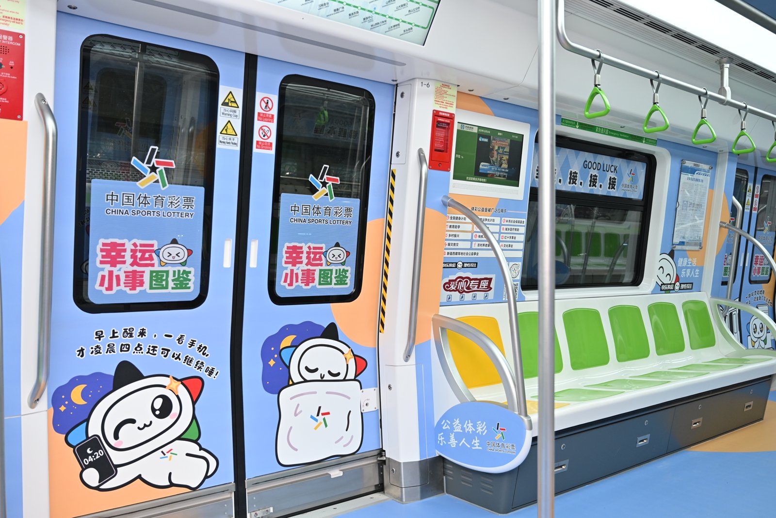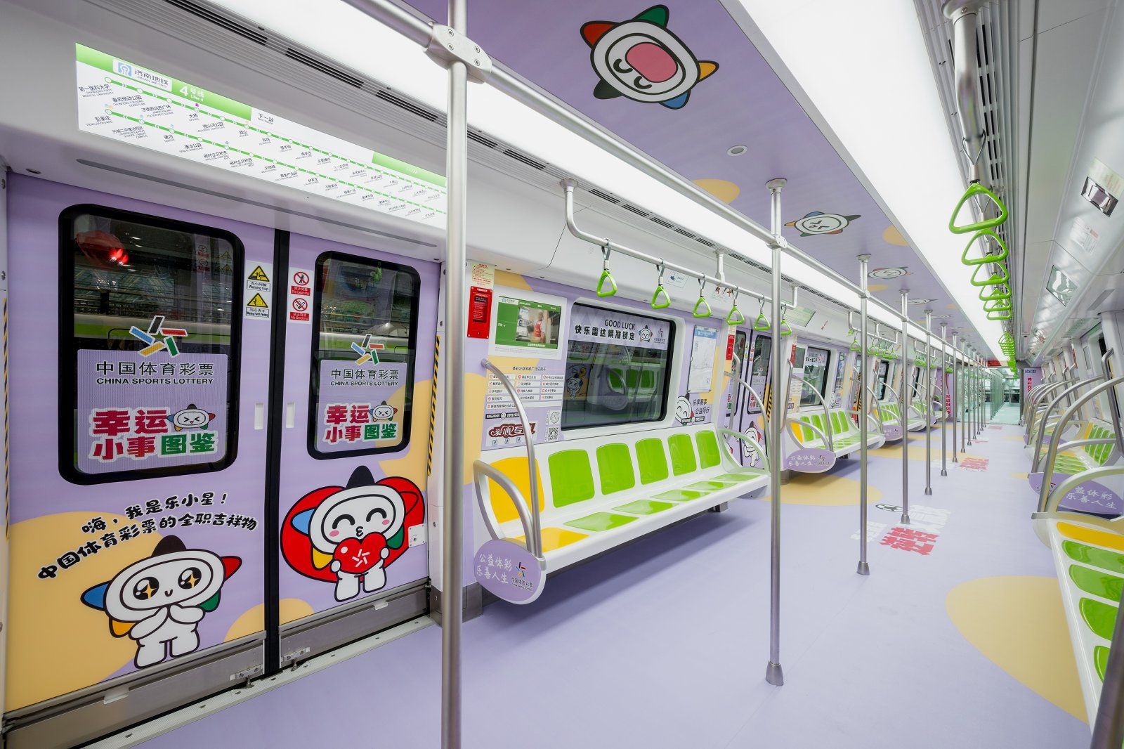 六节车厢自成天地,让每一段旅程都充满寻常又别样的欢喜。体彩品牌主题车厢内,体彩元素与“乐小星”的萌态交相辉映,“公益体彩 乐善人生”的理念随列车前行,悄然在乘客心中播下公益的种子。责任彩票主题车厢中,设计吸睛的海报与“快乐购彩 理性投注”的醒目标语,让体育彩票的责任担当深入人心。公益金主题车厢里,化身运动达人的“乐小星”在体彩公益金支持的场馆内活力运动,以漫画形式生动诠释体育彩票“来之于民 用之于民”的发行宗旨,让乘客在会心一笑间感受公益的温暖力量。