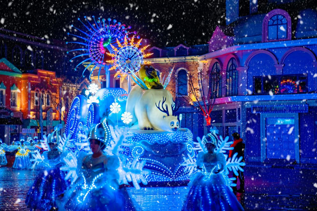 为营造沉浸式跨年氛围,青岛方特全天演出不断,为游客打造日夜不停的快乐体验。“篝火狂欢趴”驱散冬日寒意,游客们手拉手载歌载舞,以火为引,点燃2026年无尽精彩;“冰雪奇幻冬日巡游”梦幻启航,冰雪精灵与现场游客热情互动,一路欢歌,播撒浪漫与欢乐。