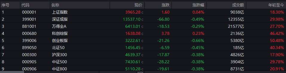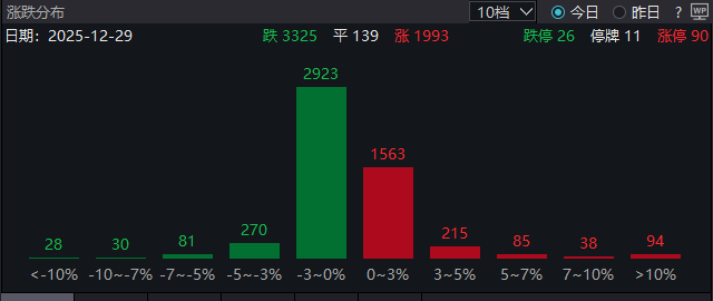 但从整体来看,截至29日收盘,沪指涨0.04%,深成指跌0.49%,创业板指跌0.66%,全市场超3300只个股下跌,沪深两市成交额2.14万亿,较上一个交易日缩量209亿。