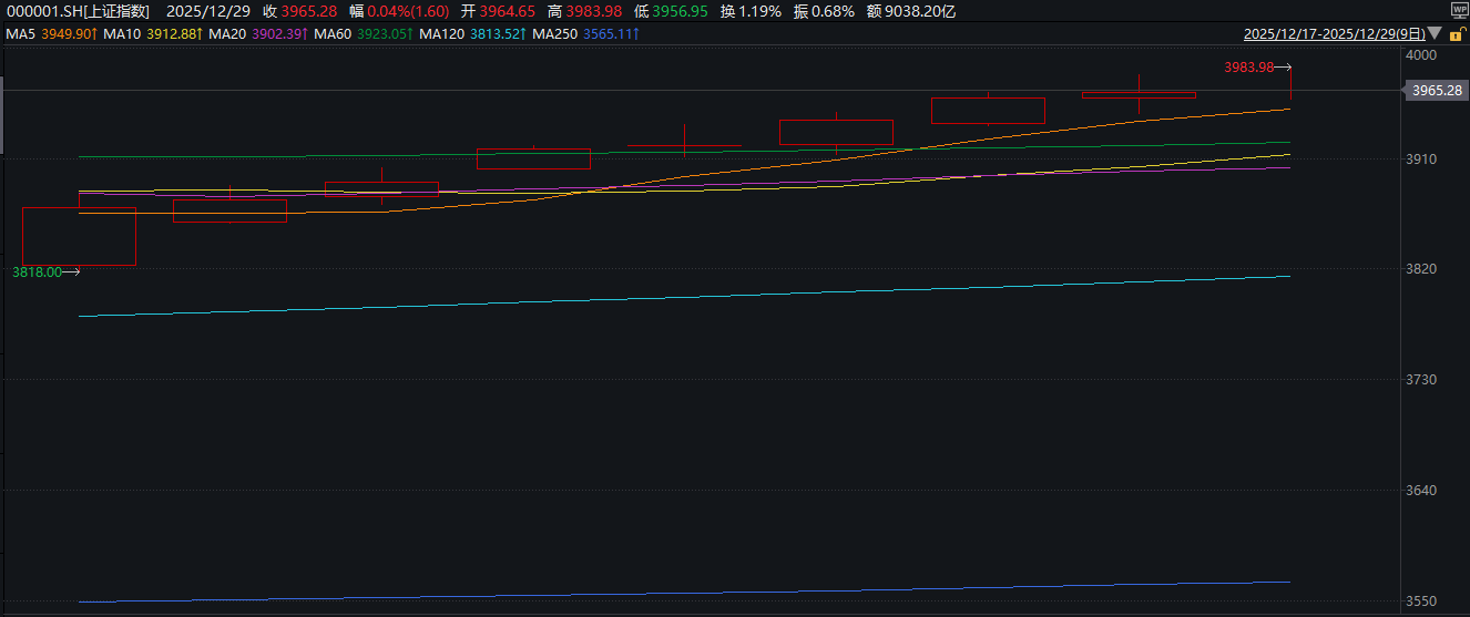 A股2025年交易收官在即,本周迎来全年最后3个交易日。继上周五沪指录得8连阳以后,本周一(12月29日)收盘,沪指微涨走出九连阳。