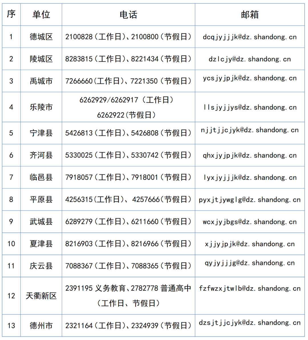 为保障学生合法休息权益,持续推进规范管理,现将德州市普通中小学违规办学监督举报渠道予以公布。各地中小学如存在假期违规补课等情况,可拨打相关电话进行反映。