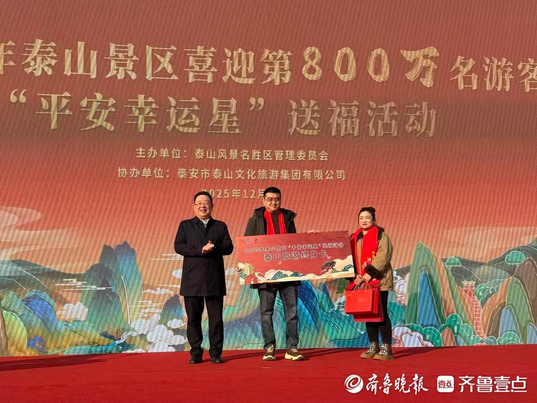 12月29日下午,2025年泰山景区喜迎第800万名游客“平安幸运星”送福活动在泰山景区红门游客中心广场举行。市领导杨洪涛、唐传营、张颖及孙磊、刘式堃、李洪洲、贾德峰等相关负责人出席活动。据了解,12月28日下午14:30,泰山迎来第800万名游客,这是2023年以来,泰山游客量第三次突破800万人,充分彰显了泰山世界文化与自然双重遗产的独特魅力,也印证了“中华泰山 国泰民安”品牌的深厚影响力。