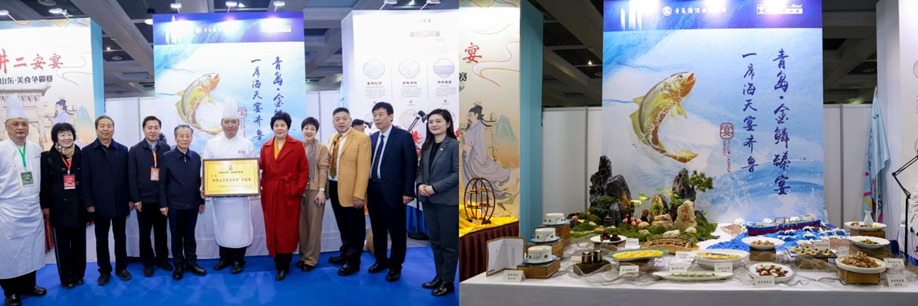 本次赛事中,青岛海天大酒店代表青岛市参与了“山东城市文化名宴”的展示与评选。酒店倾力呈现的 “青岛·金鳞臻宴——一席海天宴齐鲁” ,获得“好客山东创意美食”主题宴荣誉,宴席以“国信水产裕鲜舫深海野游大黄鱼”为核心食材,打造出一席海洋主题盛宴。宴席融合胶东风味与创新技法,从黄鱼酱、黄鱼生到黄鱼狮子头、金汤黄鱼腩,十余道菜品层层递进,完美演绎了“海天之间,至味齐鲁”的美食哲学,赢得现场评委与观众的高度赞誉。其卓越的创意与品质更赢得组委会高度认可,荣膺“好客山东创意美食”主题宴奖项,成为宴席展示环节中的亮点。