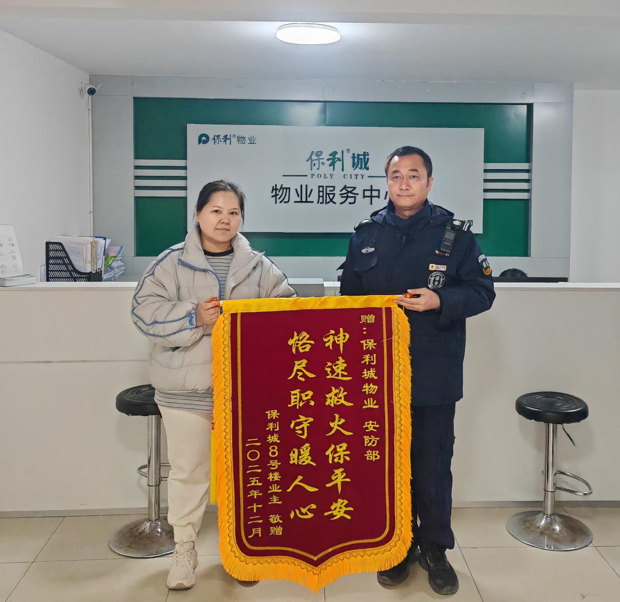 险情化解后,业主徐女士专程向物业赠送锦旗,表达对工作人员及时处置的感激之情。柳行街道物业管理办公室负责人王成全表示,此次事件体现了街道常态化开展社区安全隐患排查、强化物业应急能力建设的成效。他指出,保利城物业的快速反应不仅避免了业主财产损失,更检验了社区“智慧消防”系统和应急预案的实效性。下一步,街道联合社区物业加强消防安全宣传,提升居民自救互救能力。