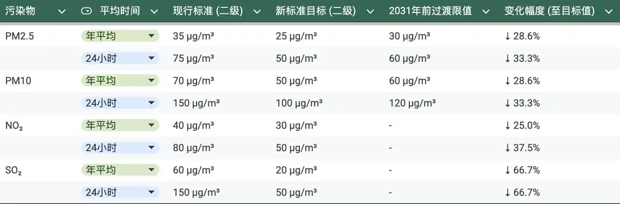 2026年至2030年为过渡期,执行PM2.5年均浓度30微克/立方米的限值;自2031年起,全面执行25微克/立方米的新限值。