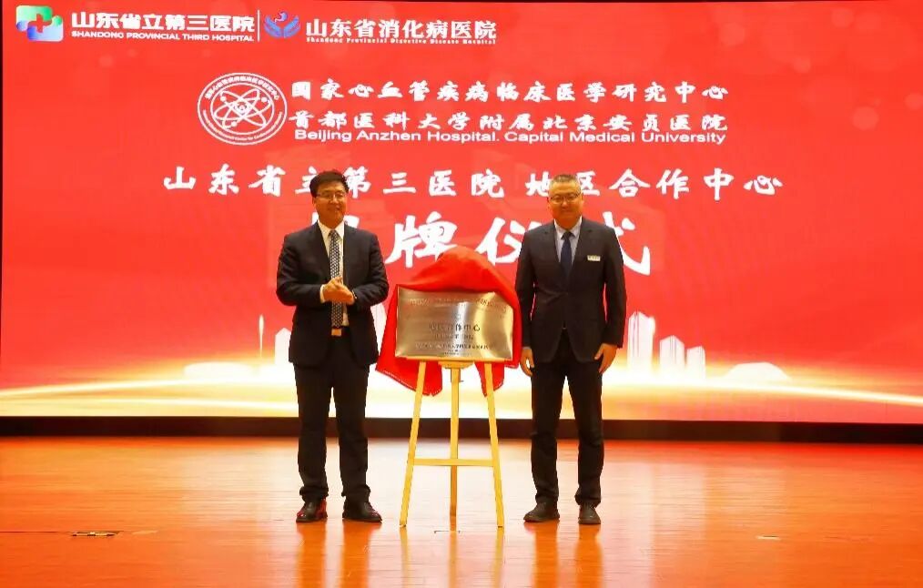首都医科大学附属北京安贞医院常务副院长周玉杰、山东省立第三医院党委书记张勇为国家心血管疾病临床医学研究中心地区合作中心揭牌