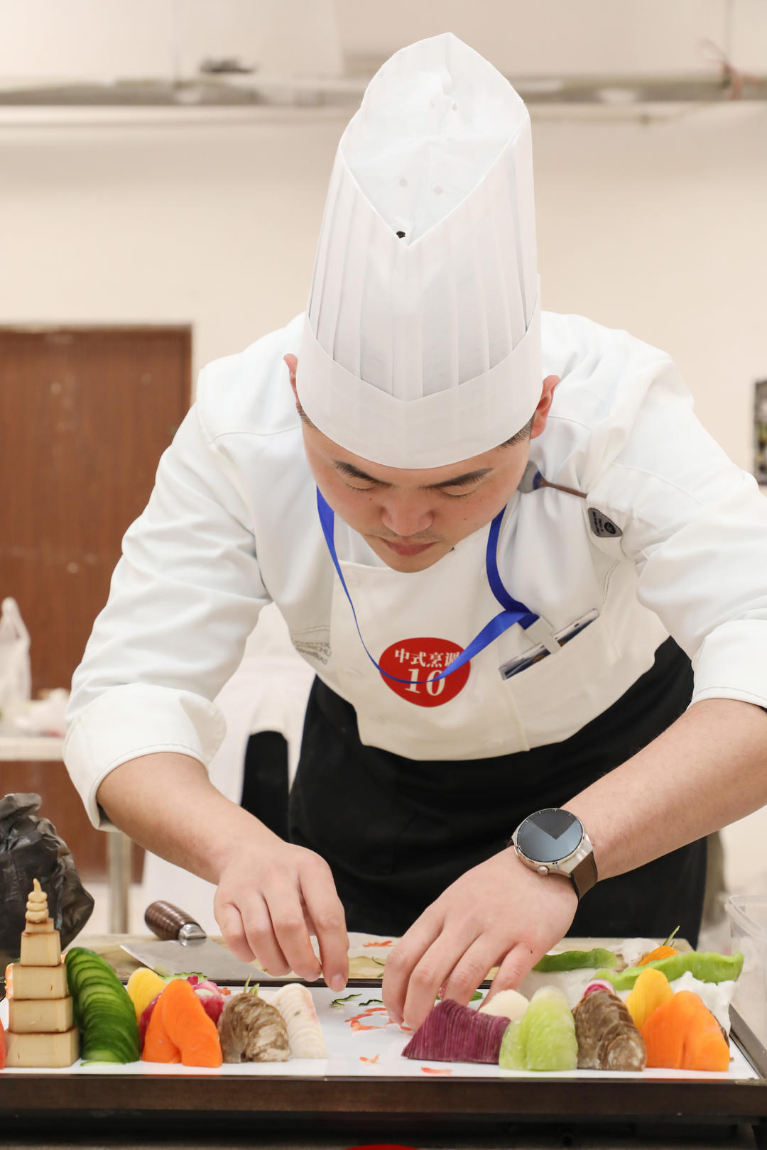 中式烹调赛区节奏紧张、锅勺铿锵。在规定菜品环节,选手们运刀如飞,调控火候一丝不苟。一位正在烹制“九转大肠”的选手紧盯锅中色泽,向身旁同伴低语:“今天火候比平时练得还要准。”创意菜比拼更是亮点纷呈,选手们大胆融合本土食材与时尚理念。评委巡视时频频点头,在一道海鲜脆皮卷前停留称赞:“想法很好,胶东鲜味守住了,造型也有突破。”