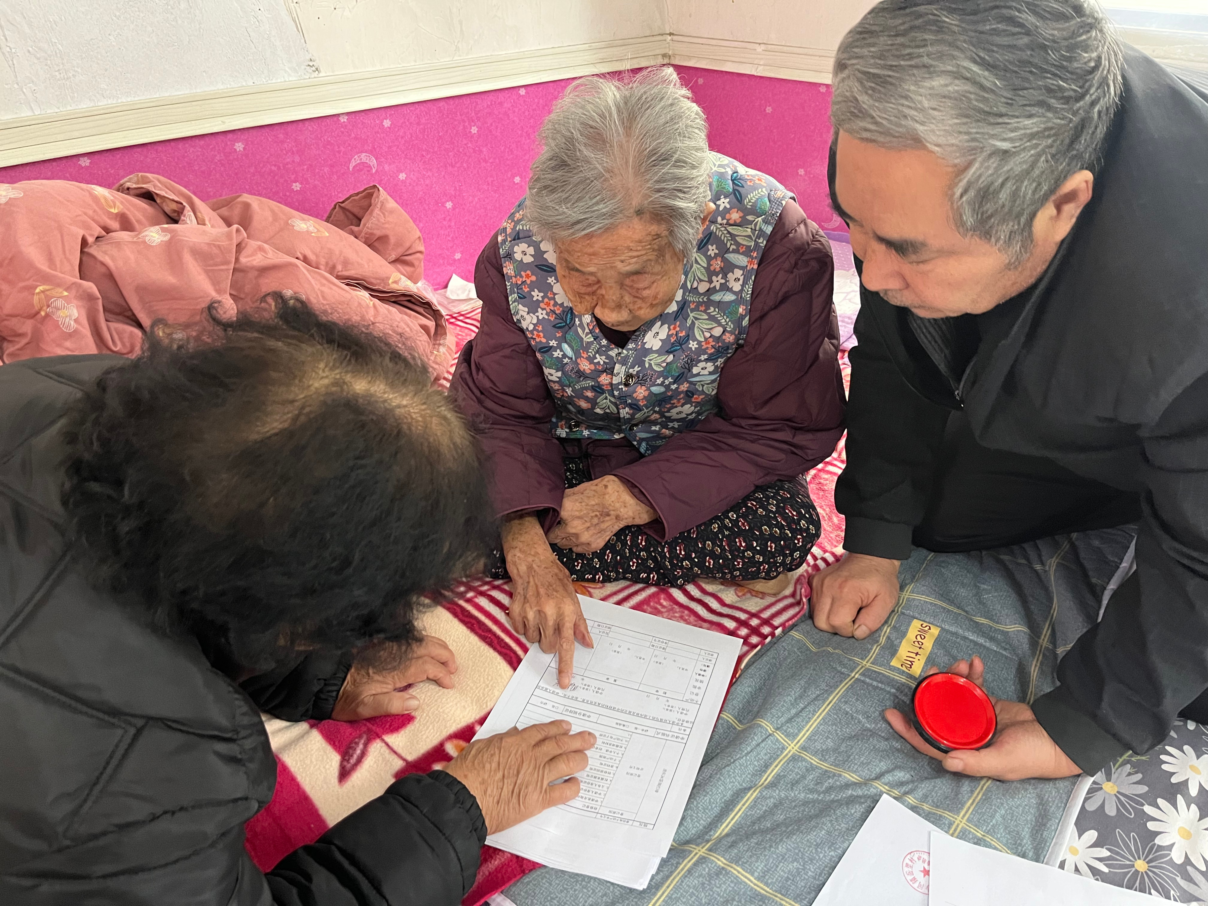 据悉,沙河自然资源和规划所工作人员在推进农村宅基地确权登记工作过程中了解到,辖区内有位年近百岁的老人需要办理不动产转移登记业务,该所立即安排专人,携带相关材料和设备前往老人家中。在老人家中,工作人员在其子女在场见证配合的情况下耐心细致地核对身份信息、确认产权关系、指导填写表格并完成现场询问笔录等必要流程,将业务手续办理“搬”到了老人的床榻边。