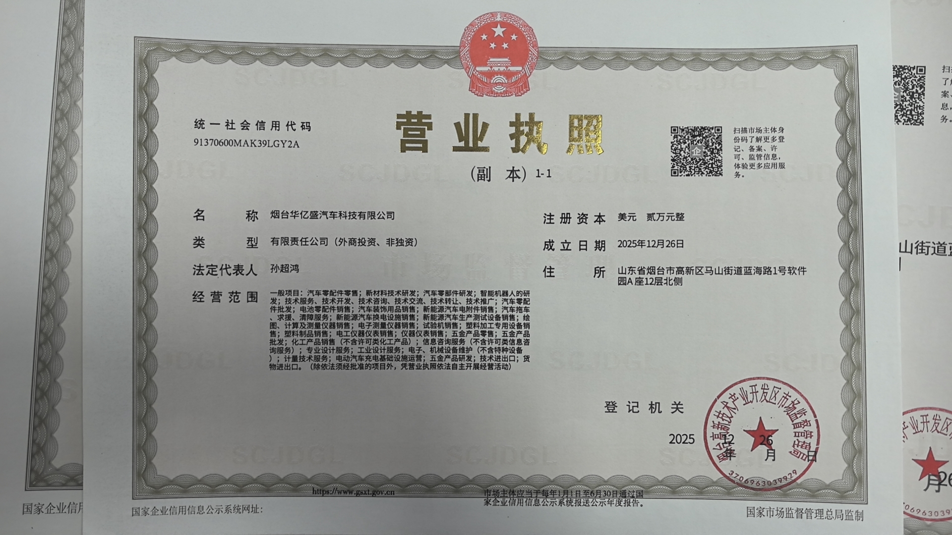 12月26日,在烟台市市场监督管理局的指导协助下,烟台高新区市场监督管理局核发了外商投资企业烟台华亿盛汽车科技有限公司设立营业执照,这是烟台高新区市场监督管理局核发的首张外商投资企业营业执照,企业从提交申请到拿到执照仅用了两天时间,标志着烟台高新区具备了外商投资企业设立、变更等登记核准权限和能力。
