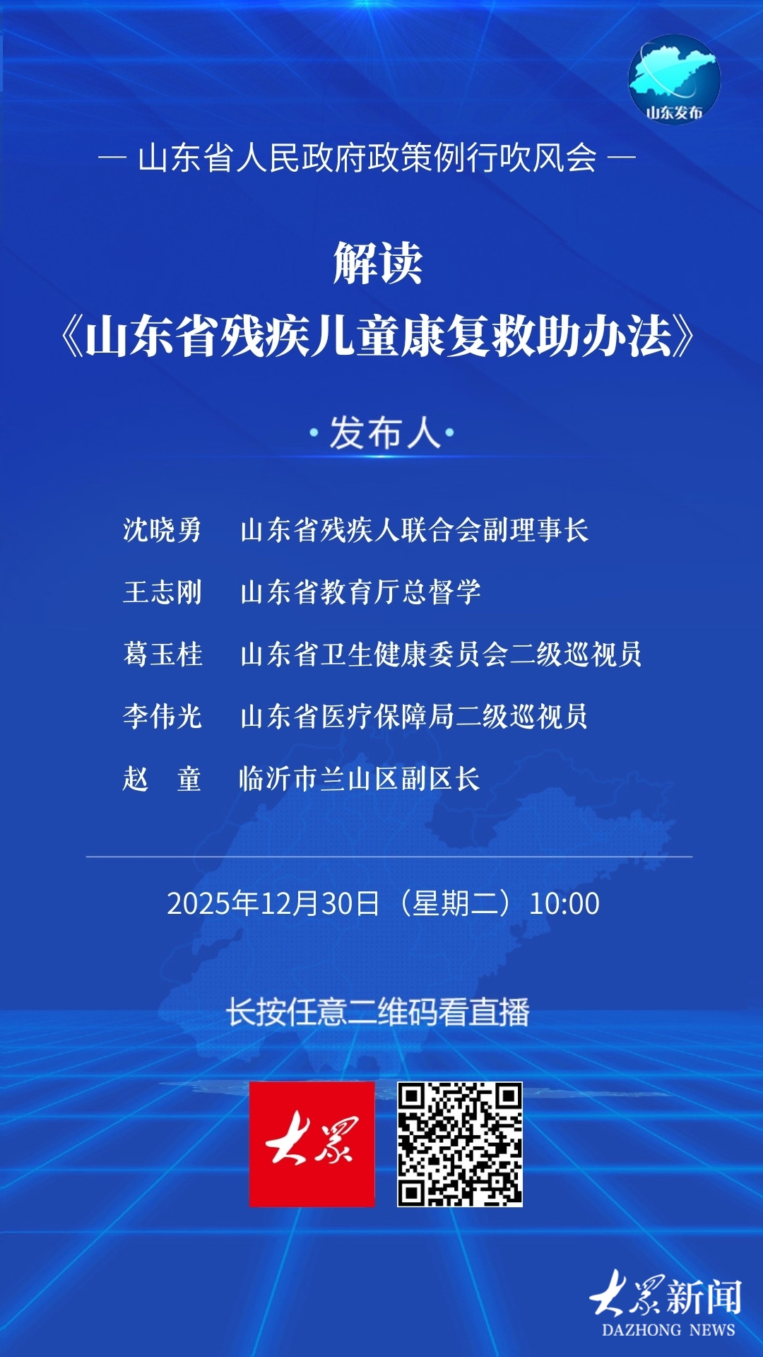 省政府新闻办定于12月30日(周二)上午10:00举行省政府政策例行吹风会,省残联负责同志等解读《山东省残疾儿童康复救助办法》。(大众新闻记者崔晗申佳鑫)