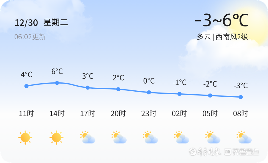 今天是2025年12月30日,星期二,农历十一月十一。烟台市今日天气多云,气温范围在-3°C到6°C之间,当前温度为-0.7°C,西南风2级,空气湿度65%,PM2.5指数52,空气质量良好。各区天气总体以晴朗为主,部分地区有云,风力较小,适合市民户外活动。