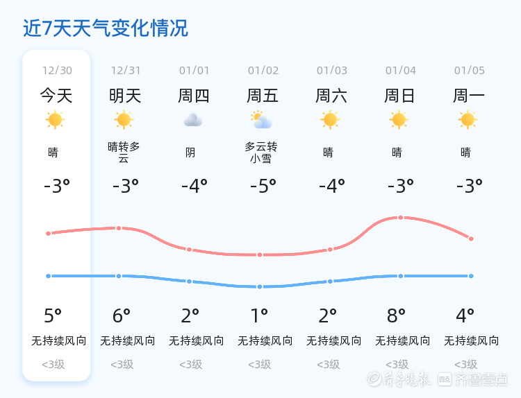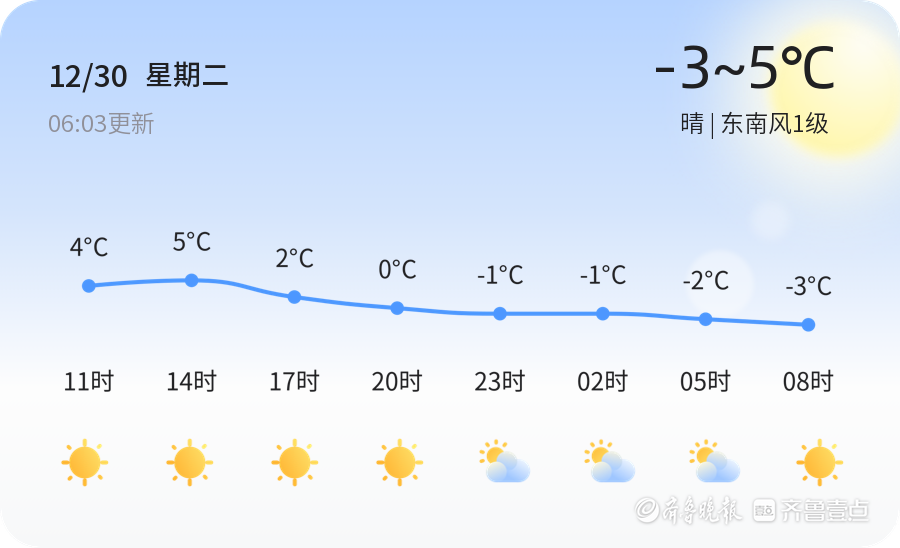今日是12月30日,星期二,农历十一月十一。潍坊市迎来晴朗天气,气温为-4℃,天气状况良好,风力较小,东南风1级,空气湿度较高,达到95%。今日全市各区天气基本一致,以晴朗为主,温度在-3℃至5℃之间。空气质量方面,PM2.5指数为77,属于良好水平,适合户外活动。