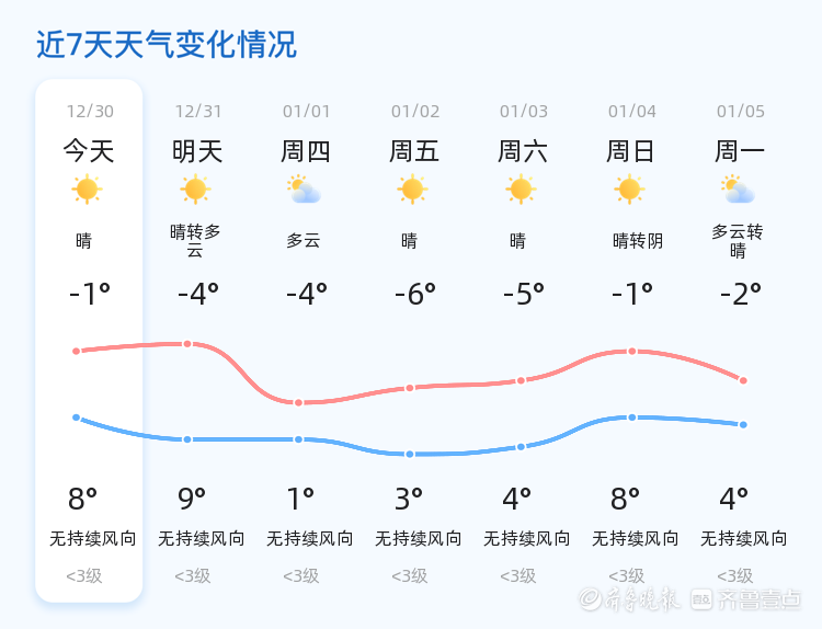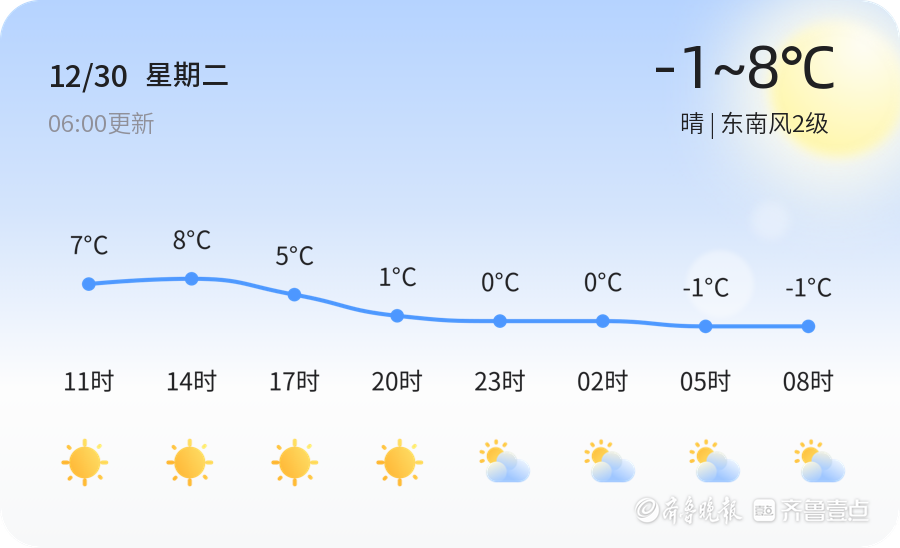 今天是12月30日,星期二,农历十一月十一。济南市今日天气晴朗,气温在-1℃到8℃之间,东南风2级,空气湿度53%,PM2.5指数114。各区天气情况基本一致,均为晴朗天气,适合市民外出活动。