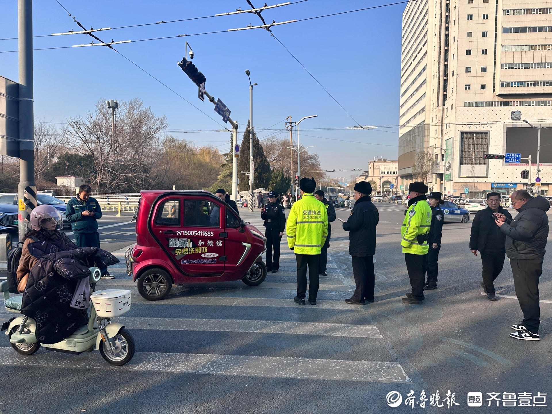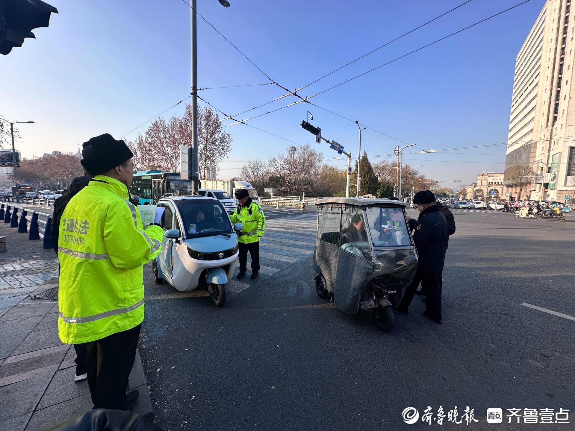 记者在现场看到,仅共青团路与趵突泉北路交叉口的执勤点位,半小时左右的时间就有近15辆动力驱动三轮车完成了登记。