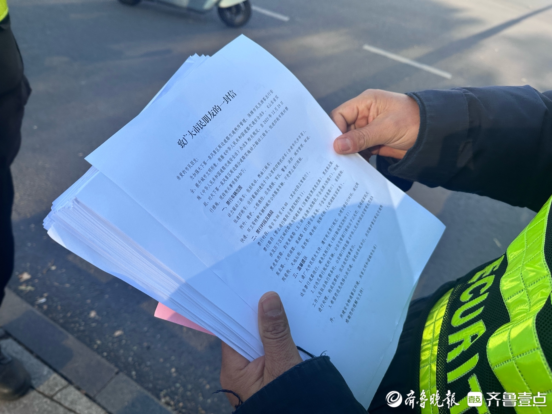 “您好,这里从今天起禁行了,以后咱们的三轮车在早上9点之后就不能再进入这个区域了。”现场,交警对每一辆驶入禁行区的三轮车逐一进行拦截,随后,工作人员给驾驶员递上《致广大市民朋友的一封信》,信中详细说明禁行路段、时间及车辆类型,还标注了绕行路线。现场有不少市民看到后,主动上前索要《致广大市民朋友的一封信》并询问绕行路线。