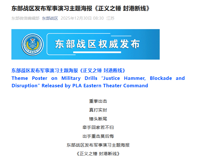东部战区发布军事演习主题海报《正义之锤 封港断线》东部战区微信公号 2025-12-30 08:35:19重拳出击真打实封锤头断尾牵手回家若不归出手重击莫后悔东部战区发布军事演习主题海报《正义之锤 封港断线》微信公众号截图责任编辑:金雪