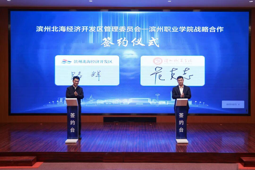 在与会人员的共同见证下,滨州市高端化工产教联合体正式成立,学校与滨州北海经济开发区管理委员会签订战略合作框架协议。