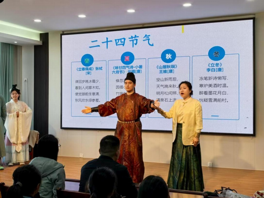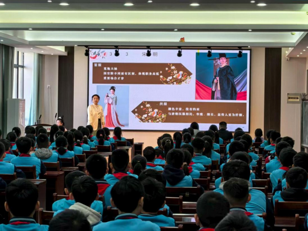 课堂上,张晓阳老师以通俗易懂的语言,为小学生们科普了二十四节气的传统智慧与汉服的文化内涵。四位学生代表身着汉服,化身“春、夏、秋、冬”四季使者,结合节气特征进行展示,生动呈现汉服与自然时序的和谐之美。