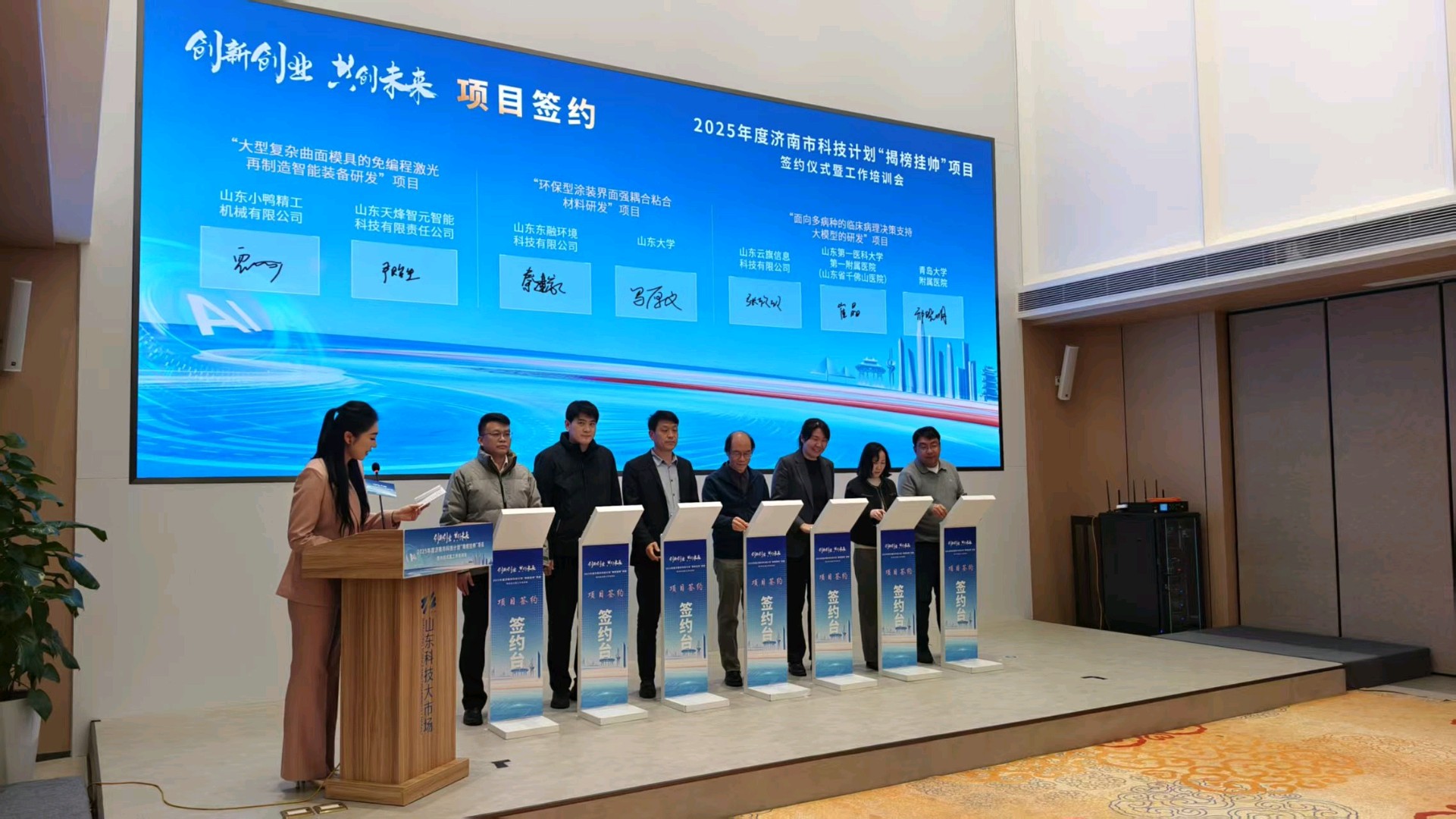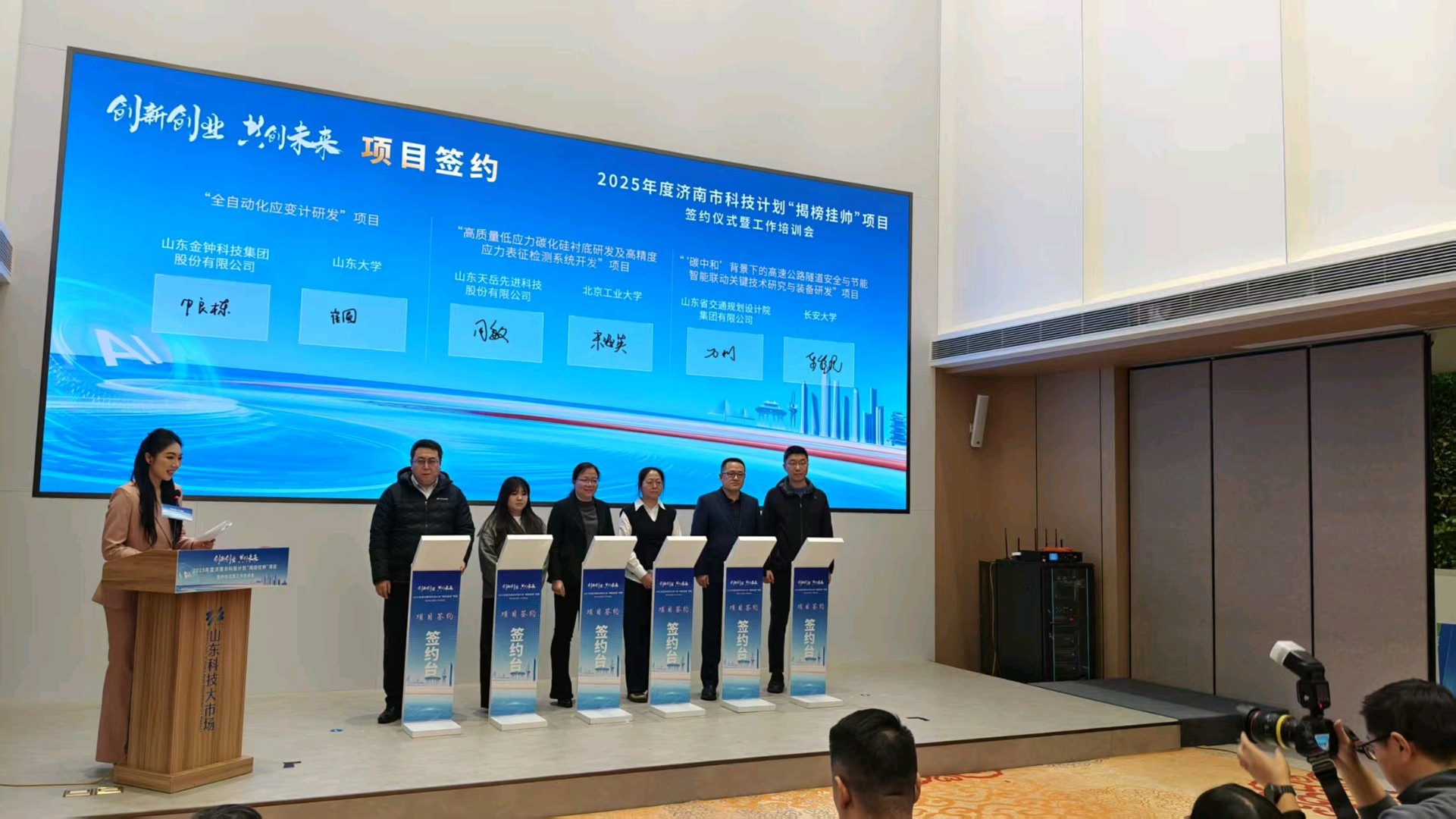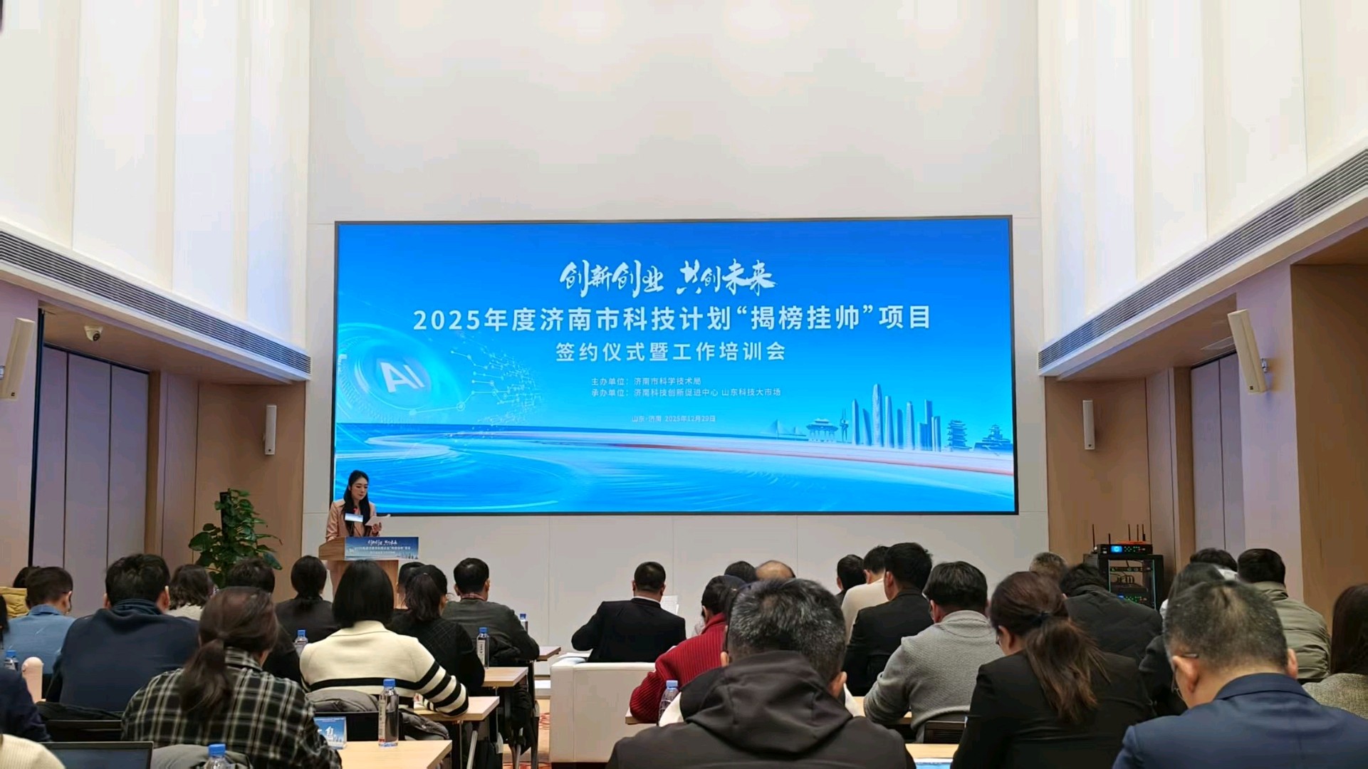 12月29日下午,“创新创业·共创未来”2025年度济南市科技计划“揭榜挂帅”项目签约仪式暨工作培训会在山东科技大市场举办。