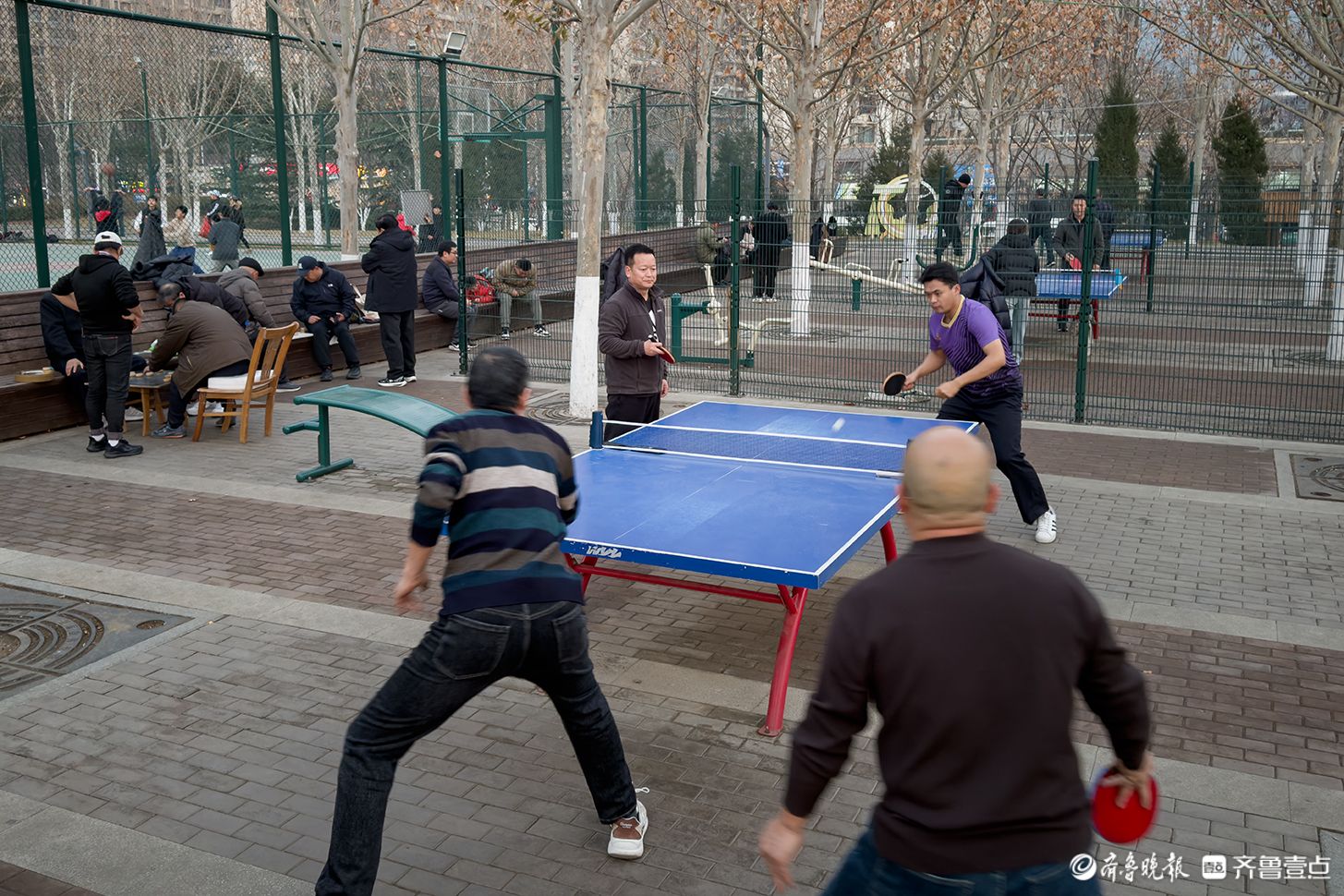 12月28日,在济南望岳康体公园的露天球台旁,有人只穿件T恤露着胳膊,弓步挥拍劲头十足,小球在球台上来回穿梭。一旁的长椅上,看客们凑着热闹支招,冷冽的风里,这片场地攒满了实打实的热乎劲儿。王剑摄
