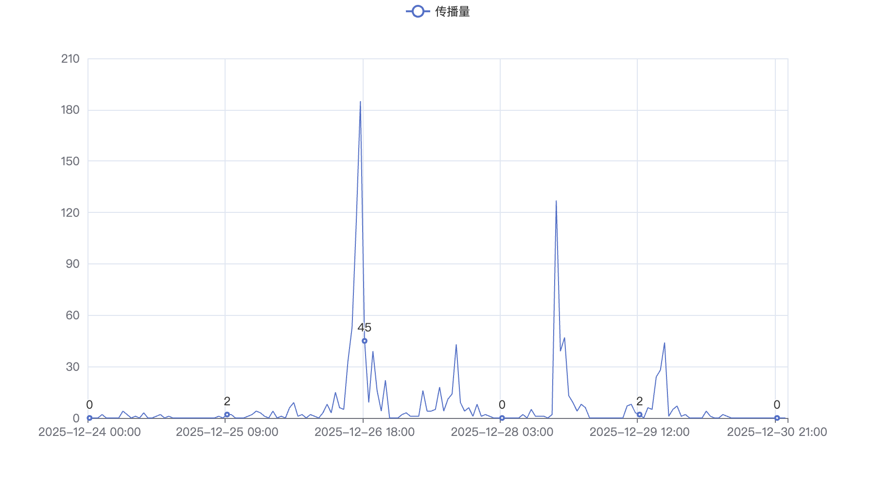 如图所示,有关2025中国婴幼儿服务产业博览会的信息传播于12月26日达到最高活跃峰值,当天信息传播数量为185条,占全部信息总量的15.51%。