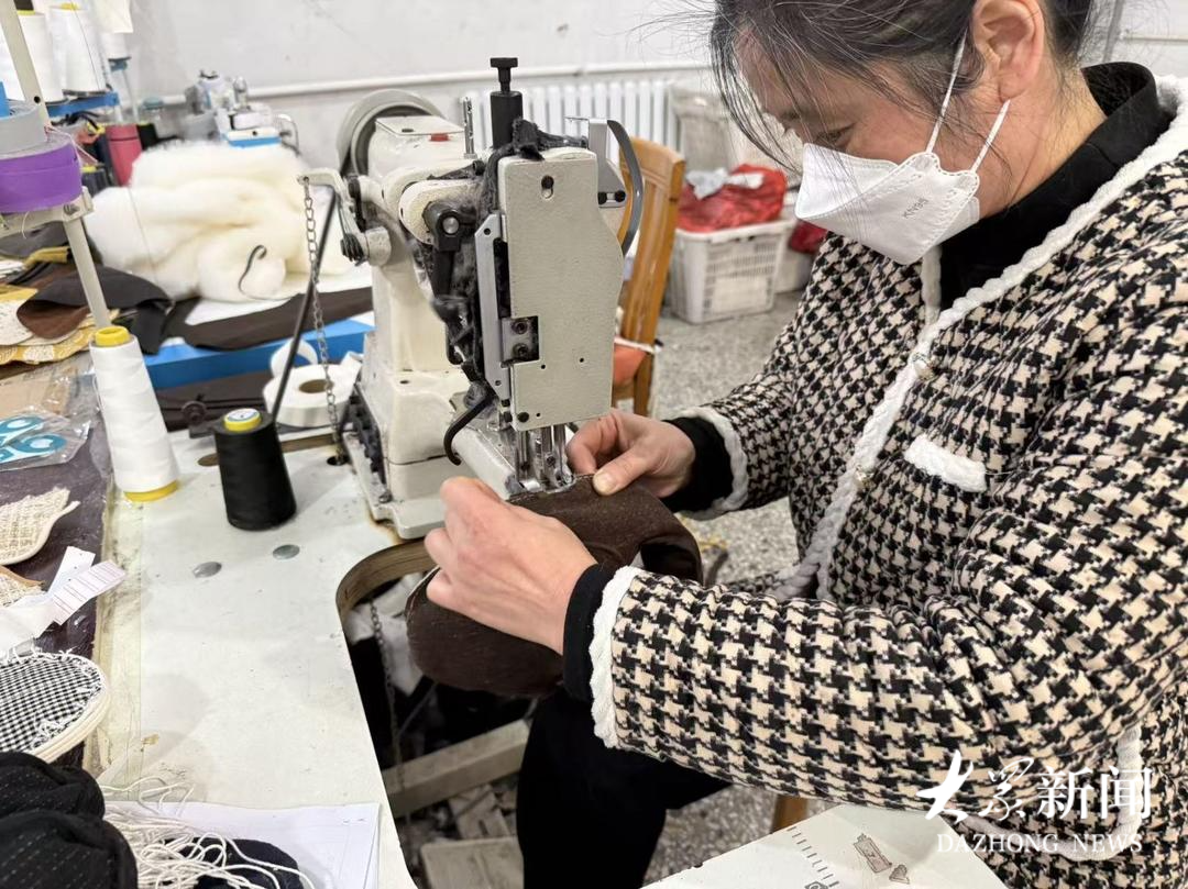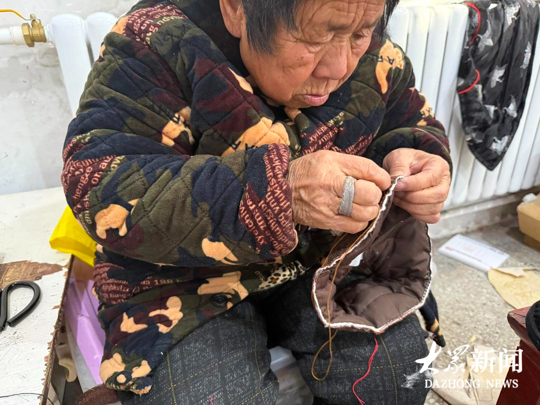 隔壁李楼村的张凤云,负责将鞋面一针一线固定到鞋底上,今年已经70多岁了,不论刮风下雨,每天都来作坊,一边干着针线活赚点钱,一边说说话聊聊天。“我这手艺,还是我妈教给我的,以前都是做给孩子们穿,现在没想到年纪大了,还有这么多年轻人喜欢以前的老布鞋。”张凤云手指上戴着顶针,一边熟练地穿针引线,一边向记者说道。