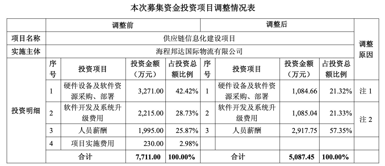 这次调整中,“供应链信息化建设项目”的“硬件设备及软件资源采购、部署”“软件开发及系统升级费用”两个投资项目的投资金额分别从3271万元、2215万元下降至1084.66万元、1085.04万元,人员薪酬从1995万元追加至2917.75万元。
