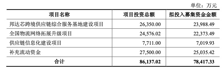 2021年5月,海程邦达上市,募集资金8.64亿元,其中2.64亿元投向邦达芯跨境供应链综合服务基地建设项目,2.46亿元投向全国物流网络拓展升级项目,0.77亿元投向供应链信息化建设项目,2.75亿元用于补充流动性资金。