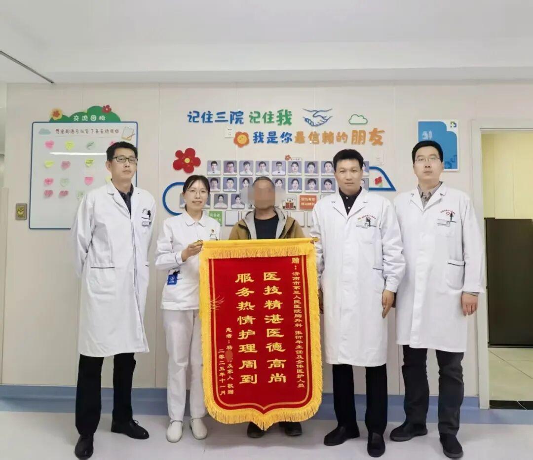 出院前,杨先生与家人将一面写有“医技精湛医德高尚,服务热情护理周到”的锦旗,送到张衍年主任及胸外科医护人员手中。锦旗背后,是说不尽的感激,也是对医院技术与服务的由衷认可,济南市第三人民医院胸外科团队以技术与担当,守护着每一位患者的生命之光。