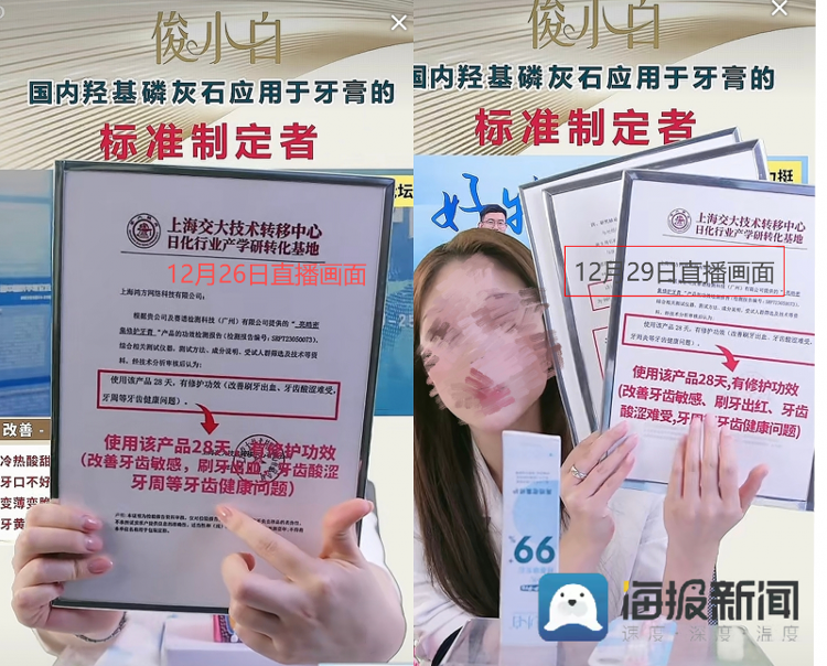 宣称含有院士团队独家研发成分、手握多项专利背书、销量超4000万支的俊小白羟基磷灰石牙膏,在直播间凭借“修护牙釉质”“美白抗敏”等功效宣传吸睛无数。然而海报新闻(报料微信:HaibaoNewsSw)记者调查发现,其宣传存在多处不实:所谓“专利高纯度羟基磷灰石”名不副实,标榜的修护、抗敏等功效并无备案依据等。目前,品牌方尚未回应记者采访。