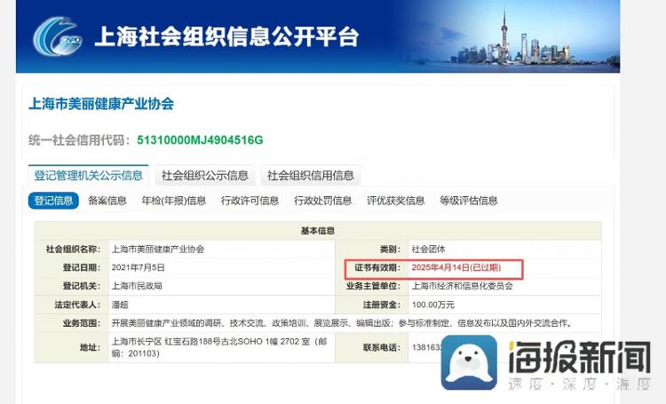 团体标准证书的颁发单位为上海市美丽健康产业协会。然而,记者在上海社会组织信息公开平台查询到,该协会的登记信息已于今年4月14日过期。记者又通过证书编号在全国团体标准信息平台查询到,该标准于2023年6月23日发布,起草单位共7家。其中,广州纳英化工有限公司和上海交植生物科技有限公司的经营范围中没有与化妆品销售、化妆品批发或化妆品生产相关的类目。