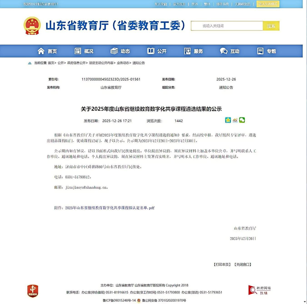 12月26日,山东省教育厅公布了2025年继续教育数字化共享课程拟认定名单,枣庄职业学院2门课程首次成功入选。这是枣庄职业学院在继续教育课程建设领域的重大突破,标志着学校职继协同发展模式下的课程建设质量迈上新台阶,也彰显了学校在继续教育起步阶段勇于探索、快速突破的创新活力与实践能力。