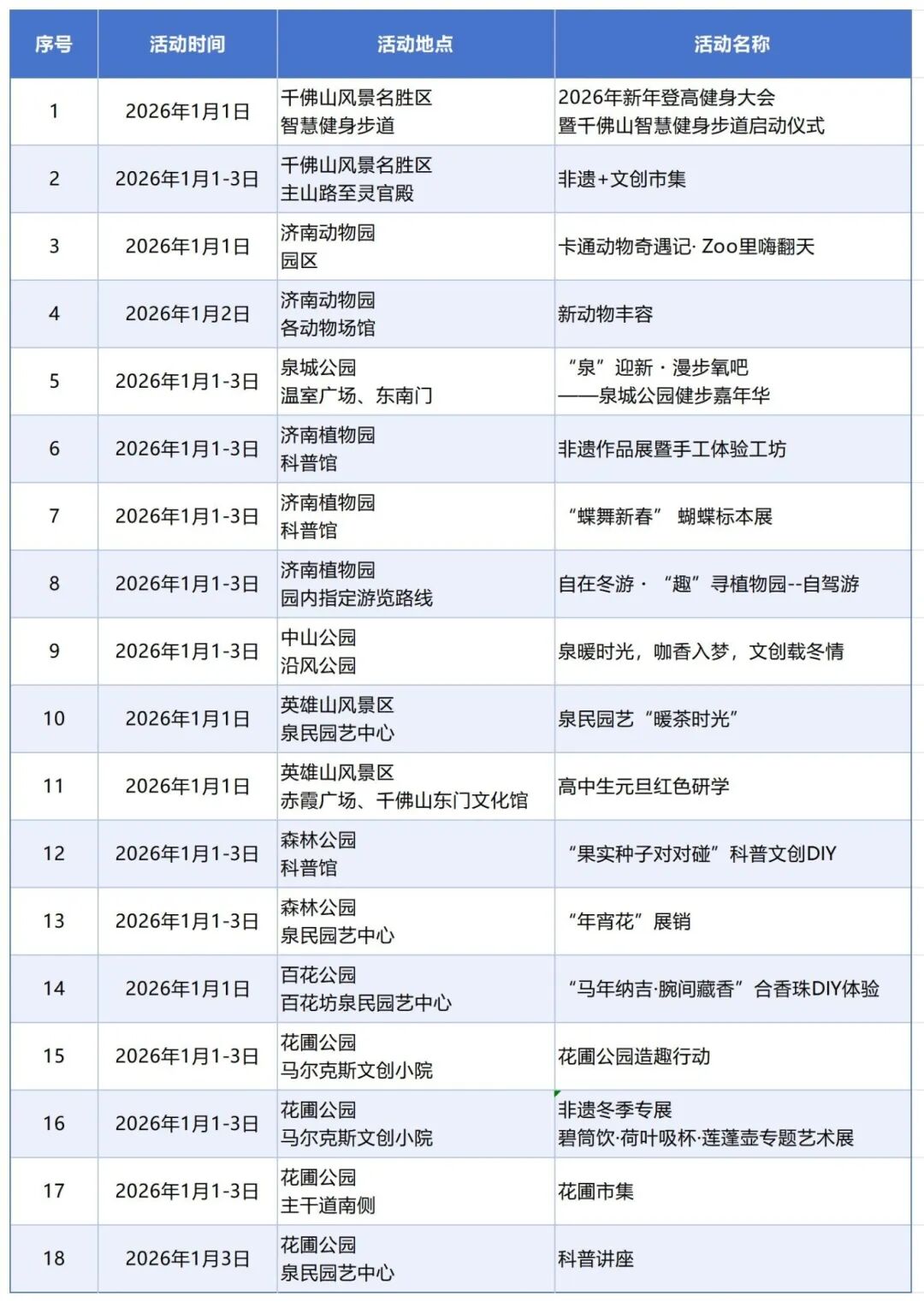 元旦将至,为丰富市民游客节日文化生活,营造欢乐祥和的节日氛围,济南市公园发展服务中心统筹千佛山、济南动物园、泉城公园等9个公园景区,精心策划了涵盖文化体验、健身休闲、科普教育、非遗展示等多个领域的特色活动,为市民游客打造多元化的节日休闲选择。“元旦”期间活动详情大众新闻·齐鲁壹点杜春娜
