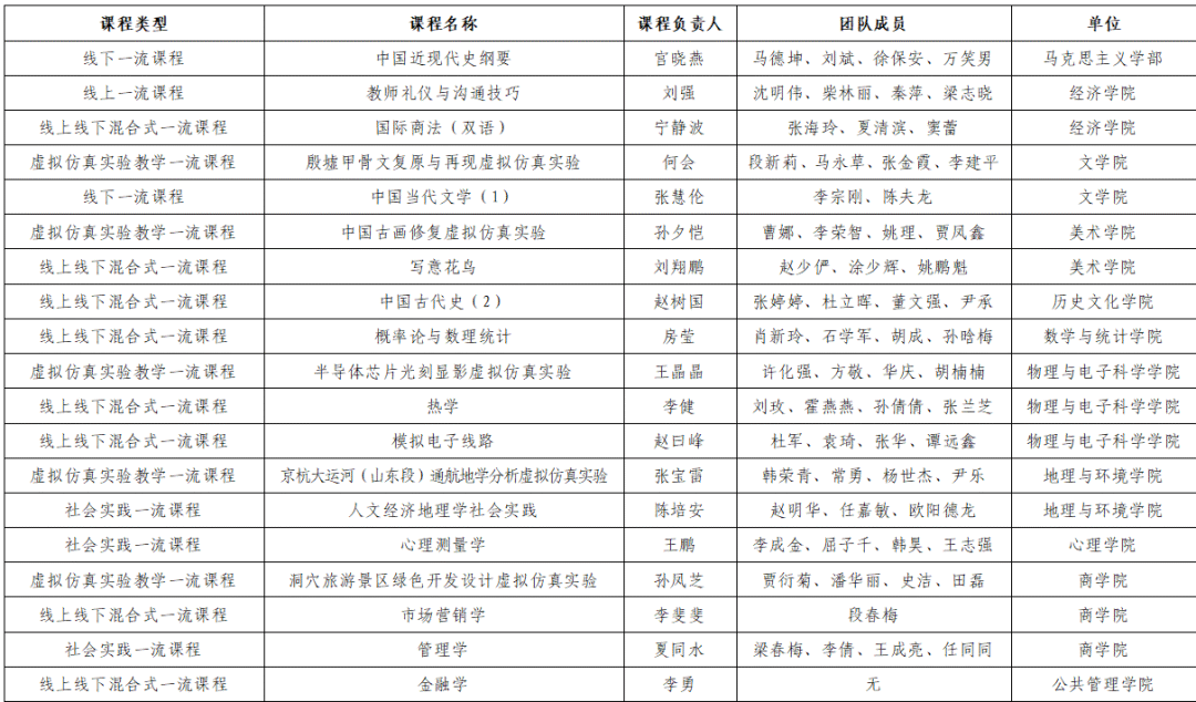 此次入选的19门课程包含1门线上一流课程《教师礼仪与沟通技巧》,2门线下一流课程为《中国近现代史纲要》《中国当代文学(1)》,8门线上线下混合式一流课程为《国际商法(双语)》《写意花鸟》《中国古代史(2)》《概率论与数理统计》《热学》《模拟电子线路》《市场营销学》《金融学》,5门虚拟仿真实验教学一流课程为《殷墟甲骨文复原与再现虚拟仿真实验》《中国古画修复虚拟仿真实验》《半导体芯片光刻显影虚拟仿真实验》《京杭大运河(山东段)通航地学分析虚拟仿真实验》《洞穴旅游景区绿色开发设计虚拟仿真实验》,3门社会实践一流课程为《人文经济地理学社会实践》《心理测量学》《管理学》。
