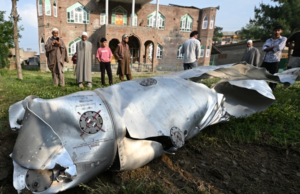 5月7日,在印控克什米尔首府斯利那加附近的普尔瓦马地区,人们围观飞机残骸。新华社
