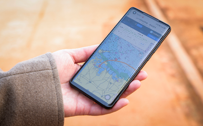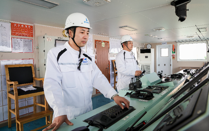 “魏桥绿动1”轮首航船长何磊与同事通过辅助驾驶系统模拟驾驶。