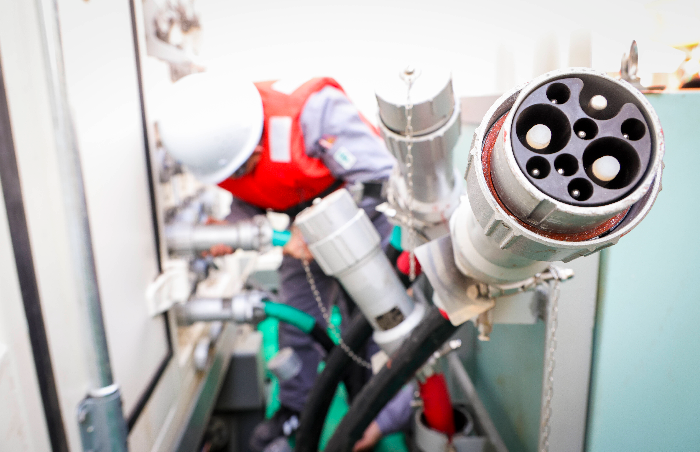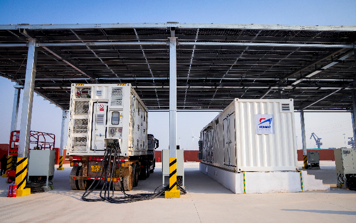 船岸协同方能致远。与“魏桥绿动1”轮同步投用的滨州无棣码头充换电储能站,堪称新能源船舶的“超级充电站”。这座占地11000余平方米的储能站,是中国首座海运电动船舶充换电站,也是全球规模最大的船舶充换电站之一,设计容量15000kVA,可同时满足5艘新能源船舶充换电需求。场站配备537.6kWp光伏系统,将太阳能转化为清洁电能,进一步提升能源利用的绿色属性。固定场充、移动式高压岸电充电设备及高压岸电箱构成的多元化补能网络,让船舶即便航行至烟台、滨州以外港口,也能通过移动充电系统对接当地高压岸电补能,彻底打消续航顾虑。