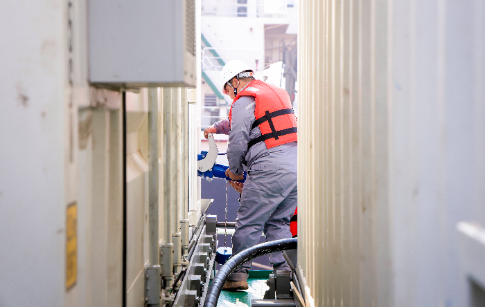 在套尔河港区,“魏桥绿动1”轮尾部的8个标准集装箱式电源格外醒目,这正是其绿色动力核心。每个电源储电量约2000度,总电量达16000度,可充分满足特定航线电力需求。贾明洋介绍:“渤海湾冬季风浪大、最低气温达零下10度,对电源稳定性考验极大。”为此,这些电源采用高密封设计,具备抗盐雾、抗震动、抗结冰等优异性能,更搭载自主知识产权的弃箱安全装置——极端火情下可远程抛离危险箱体,为船舶与船员筑牢安全防线。