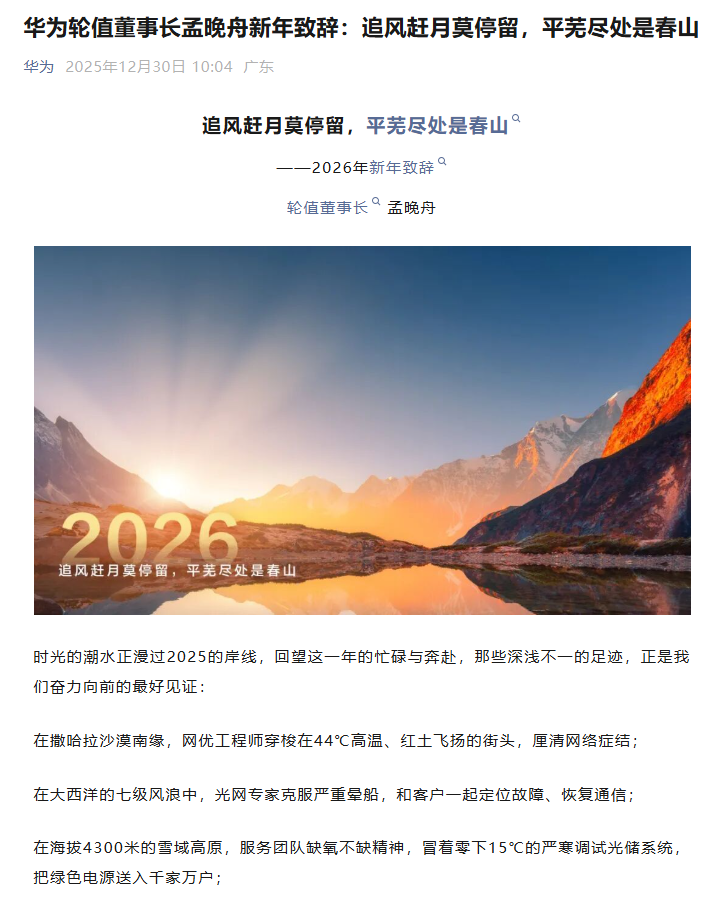12月30日,在辞别2025、迎接2026之际,华为轮值董事长孟晚舟以“追风赶月莫停留,平芜尽处是春山”为主题,向全球客户、合作伙伴、开发者及全体员工发表新年致辞。她回顾了过去一年华为在全球各地攻坚克难、砥砺前行的奋斗足迹,并展望了在智能化浪潮奔涌的新时代,华为将如何聚焦战略、决胜价值战场。