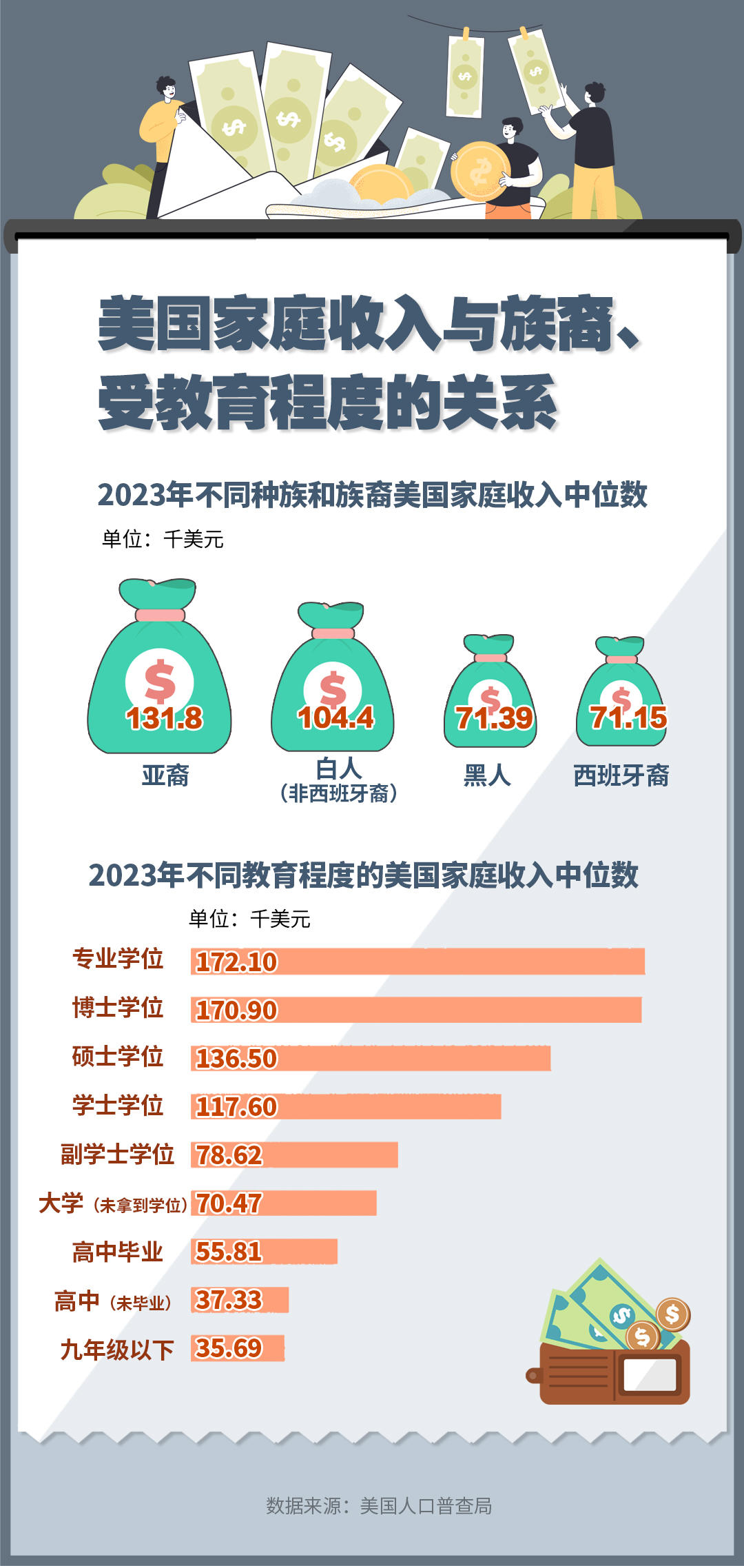 族裔差距同样显著,亚裔家庭收入中位数,达到13.18万美元,是黑人或西班牙裔的近两倍。白人家庭收入中位线达到10.4万美元,也高于整体美国家庭水平。